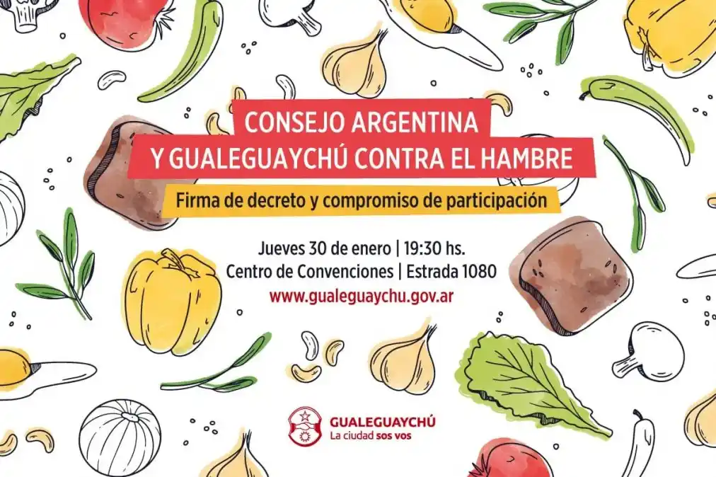 Este jueves 30 de enero a las 19.30 en el Centro de Convenciones del Parque de la Estación, el intendente Martín Piaggio realizará la firma del decreto que creará el Consejo Argentina y Gualeguaychú contra el hambre. Por este motivo, el Municipio invita a todas las instituciones interesadas de la ciudad en adherir al Consejo a participar del evento. El decreto también dispondrá la creación de la "Mesa Gualeguaychú Contra el Hambre", que estará integrada por dos representantes de cada secretaría de la Municipalidad; así como por representantes de sindicatos locales, Centro de Defensa Comercial Gualeguaychú, Centro de Almaceneros de la ciudad de Gualeguaychú, instituciones religiosas locales, Dirección Departamental de Escuelas de Gualeguaychú, Comisiones Vecinales, Buro Productivo Local. Se determinará que las funciones serán las siguientes: Promover la correcta implementación de todas las medidas que se impulsen desde los Gobiernos Nacional y Provincial para la lucha contra el hambre. Articular con actores del sector público y privado la búsqueda de recursos y soluciones para abordar la problemática. Trabajar mancomunadamente en la generación, distribución y asignación de dichos recursos. Generar acciones conjuntas tendientes a comprometer a todas las partes involucradas en la lucha contra el hambre.