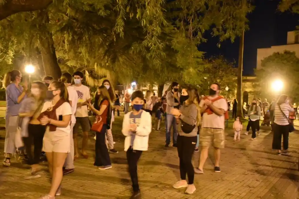 Desde minutos antes de las 20 horas, varias personas se hicieron presentes en plaza Urquiza, frente a la Municipalidad, donde comenzaron a protestar por la suspensión durante una semana de las clases presenciales en las ciudades más grandes de Entre Ríos, entre las que se encuentra Gualeguaychú. Pero debido a que el horario de la protesta viola el Decreto de Necesidad y Urgencia (DNU) en el cual se prohíbe la ocupación del espacio público luego de las 8 de la noche, los manifestantes comenzaron a caminar alrededor de la fuente haciendo palmas. Pero a medidas que daban vueltas, más personas se fueron sumando a la manifestación, teniendo que abrir el perímetro para mantener el distanciamiento y llegando de esta manera a ocupar casi las cuatro cuadras de la plaza con casi 400 personas; y eso sin contar a los que protestaron desde sus autos haciendo sonar su bocina. Igualmente, la policía trató de disuadir a las personas que formaban parte de la protesta para que dejen de ocupar el espacio público, pero ninguno dejó el lugar. La única referente política que se vio en la manifestación fue la concejal de Juntos por el Cambio Alejandra Leissa.