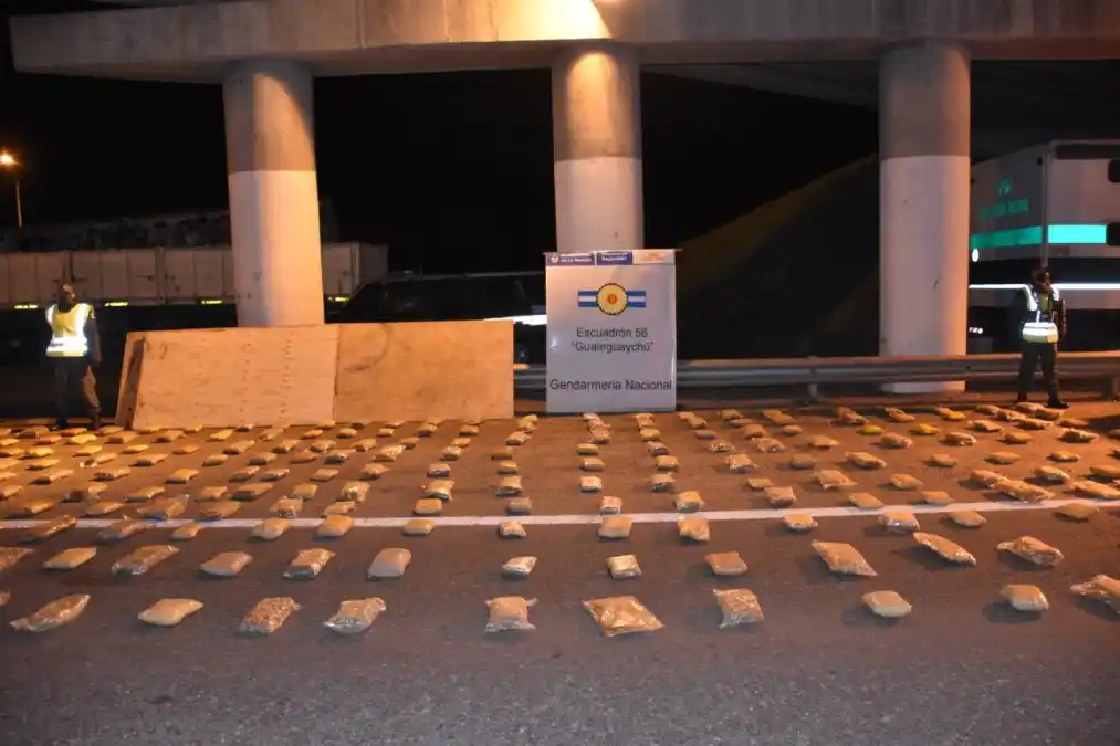 El Escuadrón 56 “Gualeguaychú” de Gendarmería Nacional, emplazados en el control de ruta de RN 14 km 73, procedió al control público y preventivo de un camión que era remolcado por un auxilio. Preguntado el chofer del rodado de donde venía , respondió que provenía de la localidad de Garupá (Misiones) con destino a la ciudad de Pilar en Buenos Aires. Detalló que había sufrido un desperfecto mecánico a la altura de la ciudad de Colón y que por eso era remolcado. Al efectuar la inspección sobre la unidad, el personal de Gendarmería detectó anomalías en la caja, observando que el piso era nuevo y de madera, que poseía un espesor de sus laterales sobredimensionado y que había sido recientemente pintado. Ante estas circunstancias, se procedió al registro mediante el empleo del binomio Guia-Can, el cual reaccionó de manera exaltada, como lo hace en presencia de sustancias estupefaciente. Con los indicios señalados, en presencia de testigos y del conductor, se procedió a retirar el piso de madera, quedando al descubierto que tenía un doble fondo en el cual se hallaban varios envoltorios ocultos. Seguidamente, se puso en conocimiento a la Fiscalía Federal de la ciudad de Gualeguaychú, con intervención del Juzgado Federal, Secretaría en lo Criminal y Correccional, quien dispuso la detención del conductor y el secuestro de los elementos de interés para la causa. En el lugar se procedió al secuestro de 237 envoltorios con Cannabis Sativa , que arrojaron un peso total de 124.989 gramos, y un avalúo estimado en $16.361.086 pesos. Además de 2 paquetes rectangulares compactos, que contenían clorohidrato de cocaína, que arrojaron un peso de 2.153 gramos por un avalúo estimado en $1.674.388 pesos. El camión, marca Mercedes Benz, tipo chasis con cabina, que transportaba la mercancía fue secuestrado, estimándose el valor del transporte en $1.500.000 pesos. También se incautó un teléfono celular. Debe destacarse que -en jurisdicción del Escuadrón 56-, la carga interceptada e incautada por la fuerza de seguridad es la mayor en la que del año. Un procedimiento que, sin dudas, es un fuerte golpe al narcotráfico.