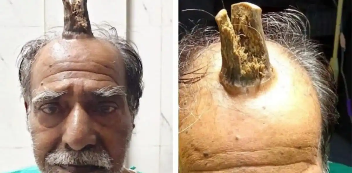 A un granjero indio le creció un 'cuerno del diablo' después de sufrir una lesión en la cabeza. Los médicos le diagnosticaron una rara condición de cuerno sebáceo, que se origina por lo general en las áreas de la piel expuestas al sol.
