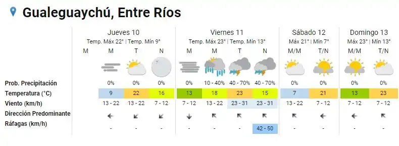 La ciudad y sus alrededores amanecieron bajo un espeso manto de niebla este jueves, que redujeron notoriamente la visibilidad, que es de apenas 0.9 km. La temperatura oscilará entre los 9ºC y los 22ºC, sin probabilidades de lluvia, que se aguardan para mañana. El viernes, según el SMN, habrá chaparrones durante la mañana y tormentas aisladas durante la tarde y la noche. FIN DE SEMANA Tanto para el sábado como para el domingo el pronóstico indica que mejorará el tiempo, con cielo parcialmente nublado y temperaturas entre los 7ºC y los 23ºC.