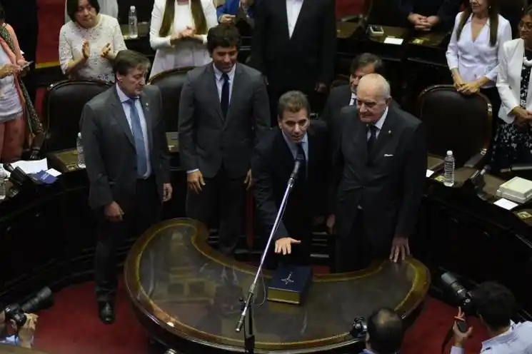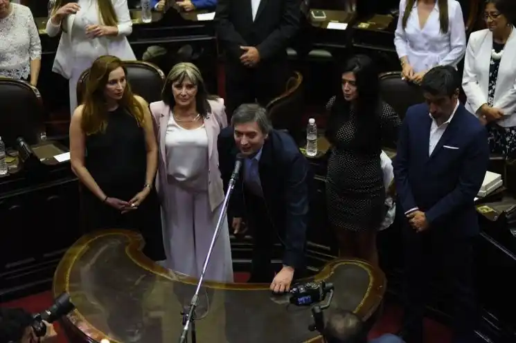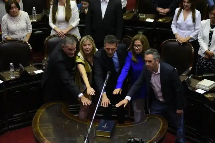 La Cámara de Diputados realizó este miércoles la sesión preparatoria del cuerpo, en la que prestaron juramento los diputados electos el 27 de octubre, y se consagró como presidente del cuerpo al líder del Frente Renovador, Sergio Massa, a partir del 10 de diciembre. La sesión se realizó con la presencia de 232 legisladores, de los cuáles 130 fueron electos el 27 de octubre; el resto tiene mandato hasta diciembre de 2021. Al comenzar la sesión, que mostró el cambio de lugar en el recinto (el oficialismo se ubicó a la derecha y la oposición ocupó el sector izquierdo), se designó al radical Gonzalo del Cerro para presidir la reunión plenaria del cuerpo, ya que es un privilegio que se le otorga al legislador de mayor edad de la cámara baja. En el primer tramo, prestaron juramento Massa y Máximo Kirchner, quienes cosecharon la mayor cantidad de aplausos de sus compañeros de bancada y los invitados especiales, ubicados en los palcos superiores del recinto de sesiones. Massa fue uno de los primeros en jurar, en medio de vítores de sus pares, y lo hizo en forma paradójica, junto a la legisladora de Consenso Federal, Graciela Camaño, con quien mantuvo una alianza hasta hace meses; luego se cruzarían en un fuerte abrazo. Máximo Kirchner sorprendió a más de uno con su juramento: "Juro por la Patria, por este día y en este día, sí, juro". El primer diputado que prestó juramento fue el pampeano radical, Martín Berhongaray quien lo hizo en primer término por "problemas de salud", según informó el secretario parlamentario del cuerpo, Ernesto Inchausti. El Frente de Todos se convirtió en la primera minoría con 120 integrantes -a sólo 9 del quórum propio- ya que se sumaron todas las bancadas que respaldaron la candidatura del presidente electo, Alberto Fernández. En tanto, el interbloque Juntos por el Cambio -conducido por el radical Mario Negri-, tendrá 116 legisladores, ya que se alejaron tres integrantes de esa bancada y se sumaron al nuevo Interbloque Unidad Federal para el Desarrollo, que conducirá el mendocino José Luis Ramón. La tercera fuerza, de 10 miembros, estará representada por el interbloque Federal que reúne a los bloques de Consenso Federal, Justicialismo, Hacemos por Córdoba, el Partido Socialista y el Frente Progresista, y que será conducido por el peronista Eduardo "Bali" Bucca". La sesión contó con la presencia del gobernador electo de Buenos Aires, Axel Kicillof y su vice Verónica Magario; de Jujuy, Gerardo Morales; de Chubut, Mariano Arcioni; de Santa Cruz, Alicia Kirchner; de La Pampa, Sergio Ziliotto; el actual vicegobernador bonaerense, Daniel Salvador; el ex secretario general de la Presidencia, Oscar Parrilli y varios intendentes bonaerenses, entre ellos el de Ituzaingó, Alberto Descalzo; de Esteban Echeverría, Fernando Gray; de Ensenada, Mario Secco, entre otros. Los legisladores, que asumirán formalmente sus bancas el martes próximo, cuando se traspase el poder, debutarán en la práctica con el tratamiento de las leyes que serán el puntapié inicial de la gestión de Alberto Fernández, entre ellas el Presupuesto 2020, que sería aprobado en sesiones extraordinarias en dos semanas. Tras las juras, el presidente del bloque del Frente de Todos, Máximo Kirchner, que debutó en esta jornada en ese rol, propuso a Massa como presidente del cuerpo, quien volverá a la cámara baja después de dos años, mientras Juntos por el Cambio se encaminaba a impulsar en las vicepresidencias primera y tercera, a Álvaro González (PRO) y Alfredo Cornejo (UCR), respectivamente. Acá el listado completo de los nuevos diputado