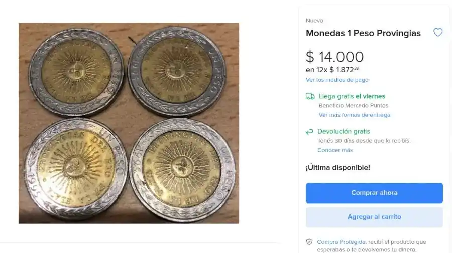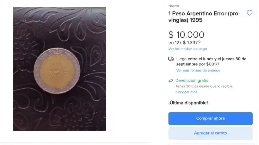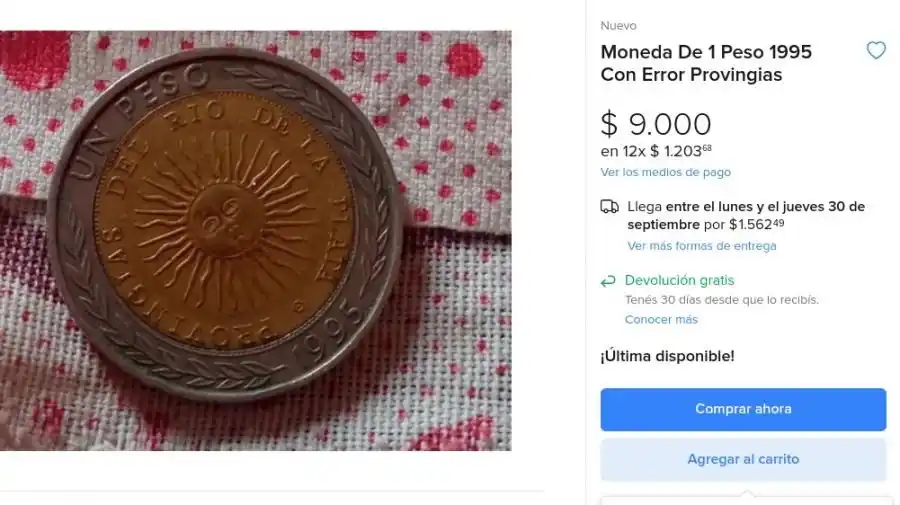 En plataformas de compra y venta por Internet, los fanáticos de la numismática ofrecen la muy codiciada moneda de $ 1 acuñada durante el menemismo con un error en el texto. Puede valer miles de pesos.