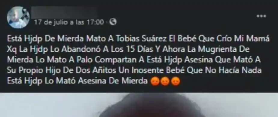 La muerte de Tobías Suárez, de 2 años, destapó una historia de maltratos y abandono con acusaciones cruzadas entre sus familiares. La furia de los allegados está dirigida a su madre Erika Julieta Suárez, de 30, y a su concubino Jorge Julio Rodríguez, de 34, quienes están detenidos por el asesinato. "El bebé estaba al cuidado de su tía, la mamá se lo llevó hace un mes y pasó esto", revelaron fuentes cercanas a la familia a cronica.com.ar. Todo comenzó entre la noche del viernes y la tarde del sábado en una casa situada en Buchardo y Saavedra, en el barrio Bosch, en el partido bonaerense de Zárate, ubicado a unos 90 kilómetros al norte de la Ciudad de Buenos Aires. Suárez, la madre, llevó al bebé al hospital San José de Campana porque supuestamente estaba "frío", pero murió poco después por un fuerte golpe en el cráneo, según determinó la posterior autopsia. Los médicos también detectaron que el chico tenía golpes en distintas partes del cuerpo; así como quemaduras con cigarrillo y más traumatismos de vieja data en el torso y la espalda. Así dieron intervención a la policía, que detuvo a la mujer y a su pareja. "En el hospital, no paraba de llorar. Decía que el nene se había caído y golpeado la cabeza durante el día anterior, pero que no lo llevó antes porque no le pareció que estaba mal, que había comido y todo", detalló una fuente cercana a la familia. Ante el fiscal Alberto Gutiérres, a cargo de la Unidad Funcional de Instrucción (UFI) 7 del Departamento Judicial Zárate - Campana, Suárez se negó a declarar, pero quien sí lo hizo fue su pareja, Rodríguez, quien tenía una pulsera electrónica en una causa que tramita en un Juzgado de Familia de Córdoba. El hombre apuntó a la mujer como autora del crimen y aseguró que al menos la había visto pegarle a su hijo en cuatro oportunidades. Al ser consultado por qué no lo evito o si no había visto las lesiones en Tobías, no supo que responder, indicaron las fuentes judiciales. Así, Gutierres dictó la detención a ambos y los imputó como coautores del "homicidio triplemente agravado por el vínculo, por alevosía y ensañamiento", que prevé la pena de prisión perpetua en un futuro juicio oral. La denuncia de sus familiares: el abandono y maltrato que sufrió Tobías La condena social es la manera que encontraron los parientes de Tobías para denunciar la inoperancia de la justicia. Es una muerte que podría haberse evitado, sostuvieron en distintos posteos de la red social de Facebook. Sus tíos publicaron imágenes de los detenidos y brindaron detalles de la vida del chico. "Mató al bebé que crío mi mamá porque (Suárez) lo abandonó cuando él tenía 15 días", escribieron. Tiempo después, Suárez fue dada por "desaparecida y todos salieron a buscarla, apareció", indicó un tío del chico. "Mi hermana tuvo Covid-19 positivo, el bebé fue a los brazos (de quien) cualquiera podía imaginar eran los mejores, su mamá biológica, que le arrebató la vida a golpes", denunció en un posteo de Facebook. La mujer que se hizo cargo de Tobías es su tía paterna, según pudo conocer este medio. "El padre biológico no podía tenerlo, se lo dio a su hermana para que lo pueda criar ella, lo tuvo re bien, pero se le prendió fuego la casa", indicó la fuente cercana a la familia. "Suárez vino a buscar al nene hace un mes, se lo llevó y pasó esto. Una jueza había dictaminado que ella tenía la custodia porque era la madre", agregó. Además de Tobías, Suárez tendría tres hijos más a cargo. Fuente: cronica.com.ar