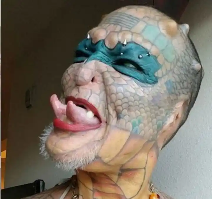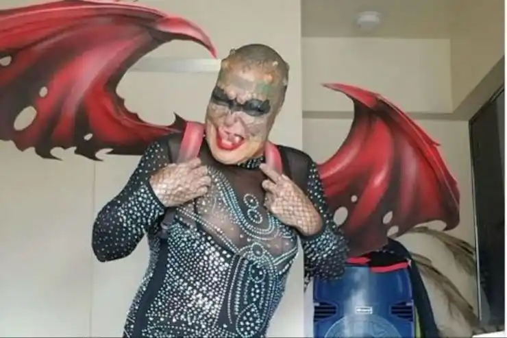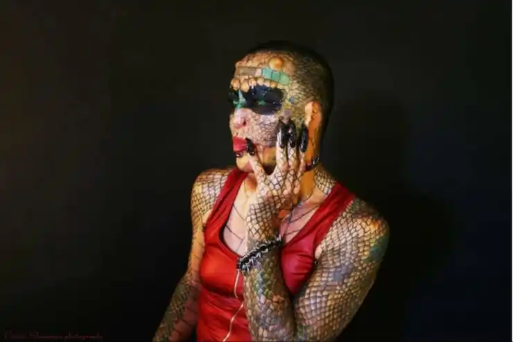 "Mitad humano, mitad reptil". Así se presenta en su cuenta de Facebook este estadounidense de 58 años, nacido como Richard Hernández, que fuera vicepresidente de un banco internacional y que ahora se hace llamar Tiamat Legión Medusa. Para convertirse en este personaje, cuyo objetivo final es ser un reptil transgénero, el exbanquero lleva gastados unos 75 mil dólares. Con ese dinero pagó más de 20 procedimientos quirúrgicos durante dos décadas que incluyeron la castración, la extracción de las orejas, la división de la lengua para hacerla bífida y el implante de 18 cuernos. Pero a su cambio de imagen aún le faltan otras intervenciones. El año próximo tiene planeado la extracción del pene y más tatuajes, para pasar de ser hombre no tener género y de humano a reptil. "Mi máxima preferencia es simplemente ser llamado 'eso', al igual que mi especie, las serpientes", dijo en Tiamat en una entrevista con la agencia británica Jam Press, que reprodujo el diario The Sun. Esta Lady Dragón, o Dama Reptil, como también se hace llamar, empezó a sentir atracción por el mundo de los reptiles cuando sufrió un hecho traumático en su infancia. "Mis padres me abandonaron en medio del bosque, una noche, en el corazón del sur de Texas, donde abunda la serpiente de cascabel de Diamondback occidenta", relató. Luego de ese abandono paternal que marcó su vida, quien es hoy Lady Reptil fue rescatada en ese mismo bosque por su abuelo, que vivía por la zona. Pero la situación familiar no mejoró, según el mismo Tiamat relató: "Mi abuelo, tristemente, continuaría abusándome verbalmente, emocionalmente y físicamente". Desde muy pequeño, Hernández supo que era homosexual, pero ocultó su condición, pues vivía en un ambiente opresivo donde sabía que salir del closet podría aumentar la hostilidad de su familia hacia él. Después de recibirse del secundario en 1979, Tiamat escapó del pequeño pueblo donde vivía para radicarse en Houston y su vida dio un giro positivo cuando pudo ingresar como empleado en el banco JP Morgan Chase. "Con una trayectoria de 15 años en la entidad, me convertí en vicepresidente y gerente de clientes en la División de Banca Corporativa del JP Morgan Chase, donde administré una cartera diversa de clientes corporativos para el banco, incluidos los diez principales clientes de una de las entidades financieras más importantes", relató Tiamat. La decisión del formal banquero de transformar su cuerpo surgió por primera vez en 1997, cuando se colocó un par de cuernos. En realidad, las modificaciones físicas comenzaron luego de que se enterara de que era portador de VIH positivo, lo que para aquel tiempo era algo así como una sentencia de muerte. "Debido a que pensé que iba a morir, comencé a modificar mi cuerpo porque sentía que estaba en una carrera contra el tiempo", señaló Lady Dragón. Las transformaciones de Tiamat Tiamat, que se puso ese nombre debido a una diosa mesopotámica que es el símbolo del caos de la creación, tiene ahora senos que crecieron como resultado de las hormonas y tuvo una extirpación de próstata y una castración como parte del cambio para ser empezar a dejar atrás el género masculino. El aspirante a dragón tiene también 18 implantes de cuernos, ambas orejas extirpadas, una extracción parcial de nariz y una remodelación inspirada en Voldemort, de Harry Potter. Tiene removidos todos los dientes, excepto seis, y todos están afilados, el blanco de ambos ojos está permanentemente teñido de verde, y tiene una bifurcación de lengua para imitar la de una serpiente. "La gente piensa que las personas modificadas, especialmente aquellas que llegan a los extremos para parecerse a algo en una película de ciencia ficción son perdedores y tontos como la suciedad, pero quiero que sepan que somos tan amables, inteligentes y amorosas como cualquier otra persona", aseguró. "Mi objetivo y misión es destruir el binarismo de género e inspirar a otros al compartir mi historia de no tener género", señaló Tiamat. La Dama Dragón espera concluir la transformación completa para 2025. En el próximo año planea embellecer las escamas de arco iris tatuadas desde su cabeza a sus pies, agregar más cuernos a los 18 que tiene ahora y añadir tinta púrpura a la mancha verde que ostenta cada globo ocular. "Mi metamorfosis no está cerca. La principal de mis prioridades es despedirme del Señor Bojangles, mi pene, lo antes posible ", concluyó Tiamat.