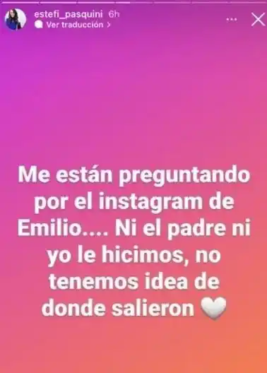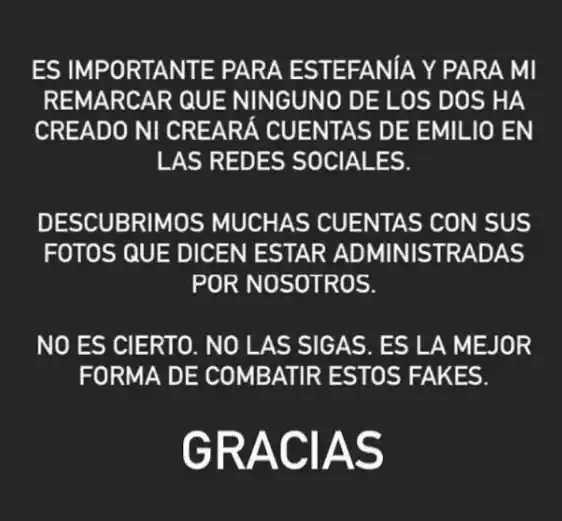 El 17 de septiembre nació Emilio Cormillot, hijo del auténtico Alberto y Estefanía Pasquini, la nutricionista de 35 años de edad que enamoró al profesional más prestigioso del rubro. Horas después, en diálogo con la prensa desde la puerta del Sanatorio Mater Dei, el prestigioso profesional brindó todos los detalles del parto por cesárea de su joven esposa, y el resto fueron palabras de felicidad y emoción a través de las redes. Pero entre las muchas publicaciones, surgió una peculiar denuncia por parte de ambos. Es que el matrimonio se ocupó de difundir que, a diferencia de Marley o Luciana Salazar, cuyos hijos tienen cuenta propia de Instagram, Emilio no correrá con esa chance. Desde su nacimiento que los usuarios quieren ver el minuto a minuto de la vida del pequeño, y es por eso que pidieron a gritos que tenga su propia red social. Tanto así que inesperadamente salió a la luz un usuario llamado Emilio Cormillot. Luego, como efecto catarata, salieron a la luz 6 cuentas más con el nombre de Emilio. Ante la inesperada situación, tanto Alberto como Estefanía se ocuparon de denunciarlas y aclarar que ninguno de ellos abrió alguna, por lo que serían cuentas falsas. "Es importante para Estefanía y para mí remarcar que ninguno de los dos ha creado ni creará cuentas de Emilio en las redes sociales", comenzó diciendo el reconocido médico en un posteo que compartió en la mencionada red social. Y agregó: "Descubrimos muchas cuentas con sus fotos que dicen estar administradas por nosotros. No es cierto. No las sigas. Es la mejor forma de combatir estos fakes. Gracias por acompañarnos". Por su parte, Estefanía también se manifestó al respecto y expresó en las redes: "Me están preguntando por el Instagram de Emilio... Ni el padre ni yo le hicimos. No tenemos idea de dónde salieron". A través de una historia de Instagram, Estefanía Pasquini denunció las cuentas falsas de Emilio. Los usuarios empatizaron al respecto y demostraron su apoyo con comentarios y emojis de bronca: "He denunciado todas las cuentas que encontré. Saludos", comentó una fan de Alberto dicha publicación. "Gracias por avisar", sumó otra seguidora. "¡¡¡¡¡Hay que reportarlos!!!!!", aconsejó una tercera. En tanto, una cuarta preguntó: "¿Qué sacan con esas cuentas falsas?". Recordemos que Estefanía Pasquini ha ingreso en un nuevo universo: la maternidad. Ella es madre primeriza, mientras que Cormillot ya era padre de Renée, de 55 años, y Adrián, de 47, frutos de su matrimonio con Monika Arborgast, quien falleció en 2017.