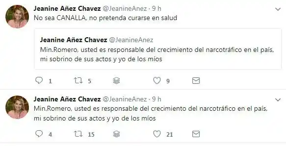 En octubre de 2017 Carlos Andrés Añéz Dorado fue detenido con 480 kilos de cocaína al aterrizar con una avioneta en Matogrosso, en el Brasil, donde aún continúa preso. Ahora se sabe que Jeanine Añez Chavez, la autoproclamada Presidenta de Bolivia, es tía del narco que los brasileños atraparon hace más de dos años. Por supuesto, esta protagonista del golpe de Estado que derrocó al ahora ex presidente Evo Morales cargó contra todos los que sacaron a la luz este dato.  En 2017, sin embargo, la guerra de "carpetazos" había comenzado cuando desde la oposición a Evo Morales se divulgó que el otro detenido en la misma avioneta era Fabio Adhemar Andrade Lima Lobo, hijo de Carmen Lima Lobo, tiempo atrás candidata del Movimiento al Socialismo (MAS) a la subgobernación de la provincia Mamoré del Beni, y casada por entonces con Célimo Andrade, ex miembro del Cartel de Cali. Por entonces, desde el gobierno reconocieron el vínculo, pero recordaron también que Andrade Lima Lobo tenía vínculo familiar directo con Hugo Vargas Lima Lobo, alcalde de San Joaquín postulado por el MNR en alianza con UD (el partido de Añez), y con Óscar Vargas Lima Lobo, excandidato a la Asamblea Departamental del Beni por UD. Los dos dirigentes antievistas son hermanos paternos de Carmen Lima Lobo. Y luego llegó la réplica letal.  "El otro sujeto que ha sido aprehendido infraganti con 480 kilos de droga en Brasil es el señor Carlos Andrés Añez Dorado, quien es sobrino de Jeanine Añez Chavez, senadora por Unidad Demócrata. Entonces igualmente en este caso estamos hablando de un vínculo familiar con una persona de actividad política", dijo el ministro Romero.