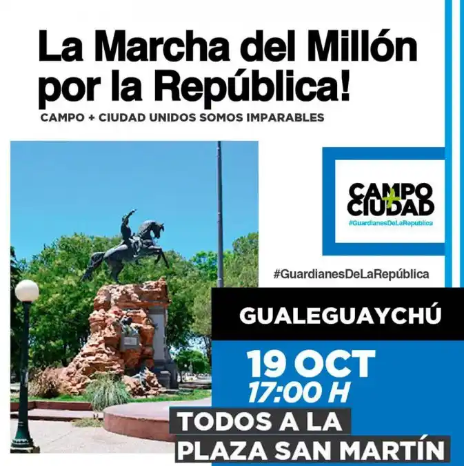 “La marcha del millón por la República” es como se dio a llamar la convocatoria que realizó el presidente Mauricio Macri al acto que realizará el sábado a la tarde en el Obelisco de la ciudad de Buenos Aires. Y para acompañar el evento, los militantes de Juntos por el Cambio de Gualeguaychú realizarán al mismo tiempo una convocatoria en la plaza San Martín. La concentración en Gualeguaychú será una réplica del acto en la 9 de Julio, al igual que pasará en más de 50 ciudades de todo el país. Pero además se habla de 30 puntos de convocatoria a lo largo de todo el país, donde se espera que desde temprano se desplacen por las rutas para llegar a la Ciudad de Buenos Aires, en un movimiento semejante al de las protestas del campo contra la Resolución 125, en 2008. “Campo + Ciudad – Unidos somos imparables” es el lema que utilizan los autodenominados “Guardianes de la República”, los militantes de Juntos por el Cambio que intentan revertir los resultados adversos que sacó el presidente Mauricio Macri en las elecciones Primarias Abiertas Simultáneas y Obligatoria (PASO), en las cuales perdió por casi 20 puntos con el candidato del peronismo Alberto Fernández.