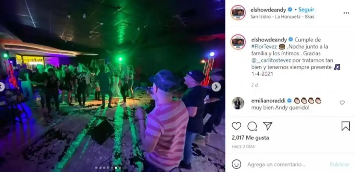 Cuando todo hacía pensar que la última victoria de Boca ante Defensa y Justicia en La Bombonera iba a traer un poco de alivio tras la drástica renuncia de Mario Pergolini como vicepresidente del club, en las últimas horas trascendió un polémico video de la fiesta de cumpleaños de Florencia Tevez, la hija del capitán e ídolo xeneize, donde se ve a todos los presentes sin respetar los protocolos de salud vigentes por la pandemia de coronavirus. Sin barbijo, ni distanciamiento. En las imágenes se lo puede ver a Carlitos, a su familia y a decenas de amigos disfrutar de la fiesta de cumpleaños de su hija que contó con la participación de dos invitados de lujo: Fer Palacio, reconocido DJ que ganó mucho reconocimiento en las redes sociales durante la cuarentena por sus remixes de "cachengue" y "El Show de Andy", un cantante de larga trayectoria en fiestas privadas y boliches. Fueron los artistas los que viralizaron imágenes de la fiesta que el capitán de Boca le organizó a su hija por su cumpleaños número 16 en su casa de San Isidro, donde el "Apache" ni sus invitados respetaron los protocolos en medio de la creciente ola de contagios de COVID-19 que atraviesa el país. La fiesta, claro está, fue previa al encuentro que disputó Boca ante Defesa y Justicia el último sábado, donde Tevez convirtió uno de los goles y fue figura. De hecho, el evento se habría llevado a cabo en la noche del jueves, previa al Viernes Santo. "Cumple de Flor Tevez. Noche junto a la familia y los íntimos. Gracias Carlitos por tratarnos tan bien y tenernos siempre presente", publicó El Show de Andy en su cuenta de Instagram. En las imágenes se puede ver que había mucha gente en el lugar, más del límite de diez personas permitido por el gobierno. Al mismo tiempo, Fer Palacio subió videos y fotos junto al capitán del conjunto azul y oro, que ahora se prepara para el partido del próximo domingo frente a Unión de Santa Fe. En uno de los videos se lo puede ver a Tevez cantando junto a Fer Palacio y El Show de Andy en el escenario, mientras su familia bailaba en el salón de su casa donde se realizó el evento. Si bien estas publicaciones generaron cierta preocupación en el mundo Boca, de momento no hubo ninguna declaración de los protagonistas ni los dirigentes de la institución. Cabe recordar que el Gobierno bonaerense decretó que las reuniones sociales recreativas no podían superar el tope de 10 personas y se había establecido la prohibición de circular entre las 2 y las 6 de la mañana para evitar el avance de la enfermedad. Días atrás, las alarmas se encendieron en Boca tras la renuncia de Pergolini como vicepresidente primero de la institución. El conductor estaba enfrentado con el Consejo de Fútbol, que conduce Juan Román Riquelme, a raíz de que este cuerpo impulsó una cuenta de Instagran y Youtube del predio de Ezeiza que choca directamente con el canal oficial del club que creó y maneja el empresario radial.