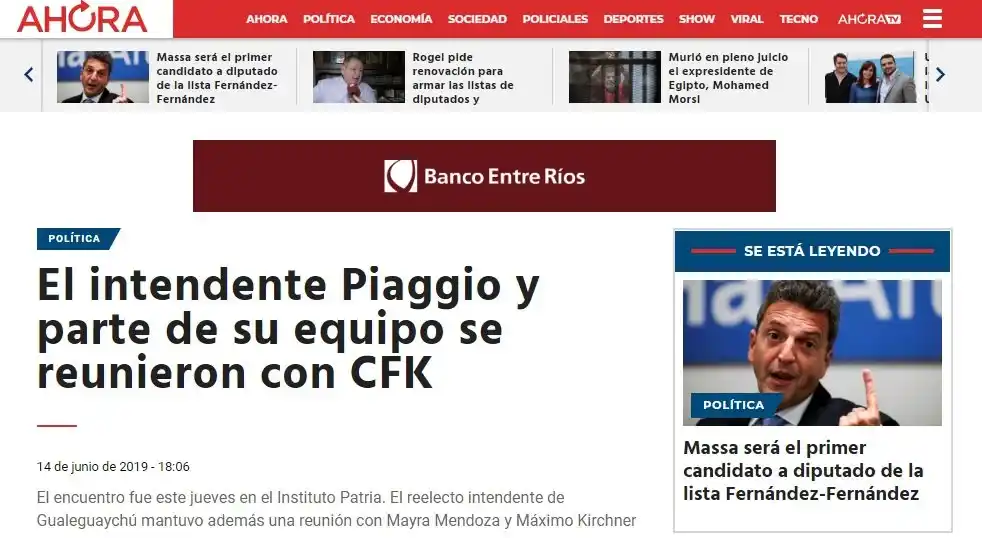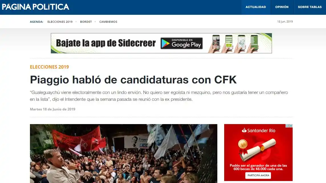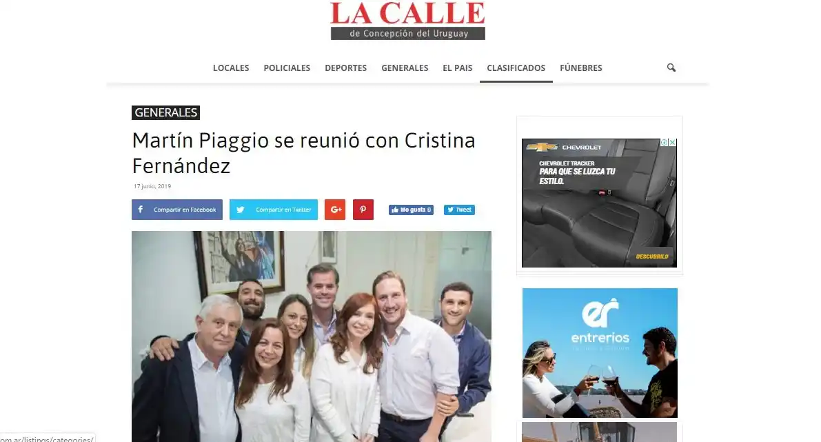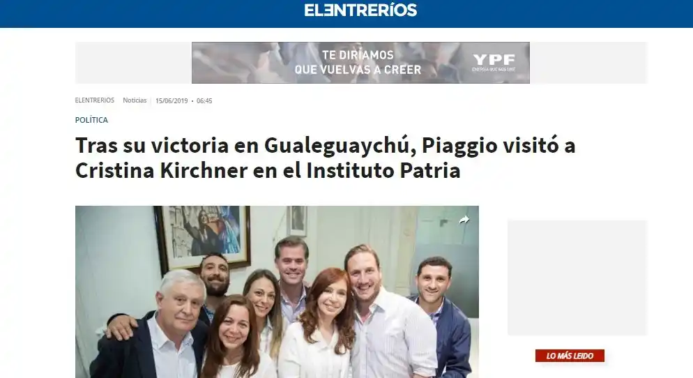 La sorpresiva reunión entre Cristina Fernández y referentes del Piaggismo llamó la atención de los medios de toda la provincia. Lo que fuentes muy cercanas al intendente calificaron como "un encuentro casual, que no estaba previsto" generó muchas lecturas políticas y el rebote mediático en distintos puntos de Entre Ríos. Página Política, el portal digital más consumido por el microclima político, aseguró que Piaggio habló de candidaturas con CFK" y aseguró que el intendente de Gualeguaychú "vuelve a aparecer en escena cuando en el oficialismo empiezan a sonar nombres para las listas de legisladores nacionales". Otro medio de la capital que trató la noticia fue Ahora. "El intendente Piaggio y parte de su equipo se reunieron con CFK", titularon replicando la nota de ElDía. El diario La Calle de Concepción del Uruguay utilizó un titular netamente informativo para contar el encuentro: "Cristina recibió al reelecto intendente de Gualeguaychú". Además agregó que si bien "la información no fue difundida, pero la foto circuló rápidamente en los celulares de la política". Otro medio que trabajó la noticia fue El Entre Ríos de Colón quién tituló "Tras su victoria en Gualeguaychú, Piaggio visitó a Cristina Kirchner en el Instituto Patria".
