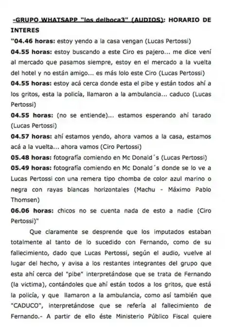 Para la fiscal Verónica Zamboni no hay dudas de que los jóvenes acusados de haber golpeado a Fernando Báez Sosa a la salida del boliche Le Brique, en Villa Gesell, sabían que el joven había fallecido. Así se desprende de los mensajes de Whatsapp enviados a un grupo del que formaban parte. A las 6.06 del 18 del mes pasado, momentos en que ya había fallecido Báez Sosa, Ciro Pertossi envió al grupo de Whatsapp "losdelboca3" el siguiente mensaje de audio: "Chicos no se cuenta nada de esto a nadie". Para la fiscal Zamboni, según el requerimiento de prisión preventiva para ocho acusados, el chat es la prueba del " pacto de silencio que incluso los imputados mantienen hasta la actualidad. Corroborando ello su participación en el hecho, como así también la total premeditación con que se cometiera el hecho". Según el dictamen de la fiscal, los chats de interés para la causa comenzaron a enviarse a las 4.46. A las 4.55, Lucas Pertossi mandó el siguiente audio: "E stoy acá cerca donde está el pibe y están todos ahí a los gritos, está la policía, llamaron a la ambulancia... caducó". " Se desprende que los imputados estaban totalmente al tanto de lo sucedido con Fernando, como de su fallecimiento, dado que Lucas Pertossi, según el audio, vuelve al lugar del hecho y avisa a los restantes integrantes del grupo que esta cerca del ´pibe´ interpretándose que se trata de la víctima, contándoles que ahí están todos a los gritos, que está la policía, y que llamaron a la ambulancia, como así también que ´caducó´, interpretándose que se refería al fallecimiento de Fernando", sostuvo la fiscal. Los mensajes de audio Lucas Pertossi: 4.46: "Estoy yendo a la casa vengan (Lucas Pertossi) Lucas Pertossi: 4.55: "Estoy buscando a este Ciro es pajero... me dice vení al mercado que pasamos siempre, estoy en el mercado a la vuelta del hotel y no están amigo... es más lolo este Ciro. Lucas Pertossi: 4.55: "Estoy acá cerca donde está el pibe y están todos ahí a los gritos, está la policía, llamaron a la ambulancia... caducó" Ciro Pertossi: 6.06: "Chicos no se cuenta nada de esto a nadie". El ataque a Báez Sosa habría sido entre las 4.44 y las 4.45. Según pudo reconstruir la representante del Ministerio Público, los integrantes del grupo de Whatsapp serían Luciano Pertossi, Blas Cinalli, Matías Benicelli, Juan Pedro Guarino, Alejo Milanesi, Ciro Pertossi, Máximo Thomsen, Enzo Comelli, Lucas y un joven llamado Santino que no está entre los imputados. No solo había audios, también los especialistas de la Policía Federal Argentina (PFA) que hicieron el peritaje telefónico recuperaron mensajes escritos. El intercambio comenzó a las 4.53 del 18 del mes pasado, después de la golpiza a Báez Sosa. A las 4.56, Alejo Milanesi pide que se reporten. En los chats van informado dónde estaba cada uno hasta que a las 6.06, Benicelli sostuvo: " Eu amigo dejen de lorear [sic]. Que están preguntando los otros pibes si nos peleamos". La llegada de la policía Después de las 10.30, los chats se volvieron a activar. A las 10.38 con 46 segundos, Ciro Pertossi soltó: "Policía afuera". Cinalli, que el chat aparece con Blas Croto respondió a las 10.39 con 28 segundos: "Sí, mal". Y cuatro segundos después agregó: "Está la poli". A lo que Ciro Pertossi, casi en el acto, ordenó: " Salgamos". (fuente: La Nación / autor: Gabriel Di Nicola)