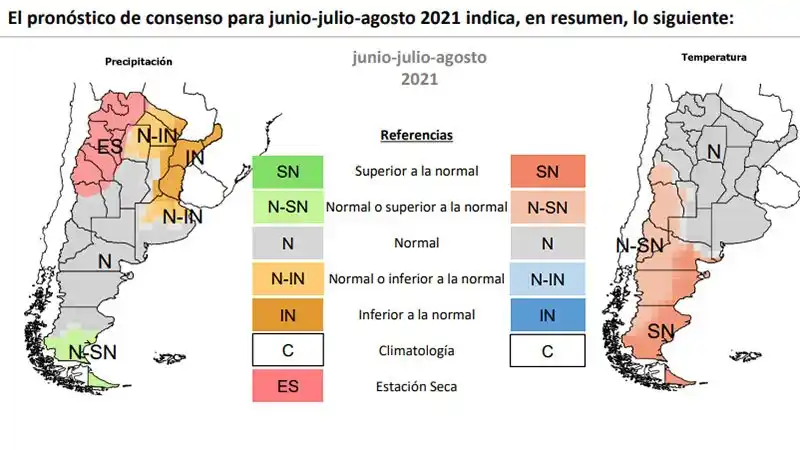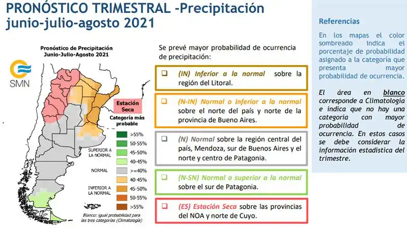 El Servicio Nacional adelantó su pronóstico trimestral que abarca de junio a agosto. En el mismo se prevén lluvias inferiores a las normales y temperaturas dentro de lo que se considera habitual para esta época del año en Entre Ríos. El informe al que tuvo acceso Elonce da cuenta de que “se observan regiones donde las previsiones numéricas experimentales de los principales modelos globales de simulación del clima y modelos estadísticos indican diferencias en cuanto a las probabilidades en el pronóstico estacional”. No obstante, “el pronóstico de consenso para junio-julio-agosto de 2021”, en cuanto a las precipitaciones prevé mayor probabilidad de ocurrencia de lluvias inferiores a lo normal sobre la región del Litoral, incluida la provincia de Entre Ríos.  Asimismo, anuncia precipitaciones normales o inferiores a las normales en el norte del país y norte de la provincia de Buenos Aires.Normales sobre la región central del país, Mendoza, sur de Buenos Aires y el norte y centro de Patagonia. Finalmente, se anuncia estación seca en las provincias del NOA y norte de Cuyo.TemperaturasMientras tanto se estima mayor probabilidad de ocurrencia de temperatura media superior a la normal sobre el este y sur de la Patagonia.  Normal sobre todo el centro-este (incluida Entre Ríos) y norte del país.Finalmente, “ no se descarta una mayor frecuencia de temperaturas mínimas diarias más bajas de lo normal, especialmente sobre el centro-este y noreste del país”, por lo que se sugiere “mantenerse actualizado con los pronósticos de menor escala, diaria y semanal, como así también los avisos de advertencias por bajas temperaturas.”. Elonce.com