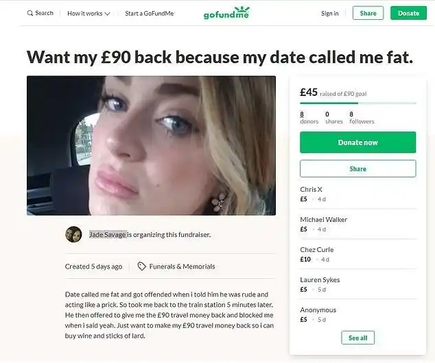 Una joven británica, de 28 años, viajó cuatro horas para encontrarse con un hombre que conoció por Tinder y con quien había tenido una cita cuatro semanas antes. Al llegar al lugar, recibió una insólita respuesta de su amante, quien la trató de "gorda". Jade Savage tomó el tren desde Leicester a Peterborough, lo que le generó un gasto de 150 dólares. Como si eso no fuera suficiente, cuando llegó a la estación donde la esperaba su amante, él la recibió con una observación desafortunada: "Mierda, tenés más peso que la vez anterior". A pesar del incómodo momento, Jade decidió ir hasta el auto del hombre y le señaló que era un idiota por ese comentario. Su respuesta fue abrupta: "¿Creés que soy un idiota? Te lo repito, engordaste". "Me llevó de regreso a la estación y me dijo que lo había puesto de mal humor y que tenía que irme a mi casa", explicó la joven sobre el final de su nefasta cita. Antes de bajarse del auto, le reclamó los gastos que le ocasionó ir a verlo y si bien él acordó que iba a devolvérselo, luego la bloqueó por WhatsApp. Para compensar esa pérdida monetaria, contó su frustrado encuentro en redes sociales y abrió una página para recaudar fondos en GoFundMe. "Quiero mis 90 libras de vuelta porque mi cita me llamó gorda", tituló la mujer, quien logró recaudar 775 libras en pocas horas. En esa página también detalló los gastos en dólares: taxi a la estación de Leicester (23 dólares), turno perdido en el gimnasio (19 dólares), tren a Peterborough (34 dólares), vino en la estación (7 dólares), tren de regreso a Leicester (34 dólares) y taxi a casa (23 dólares). Si bien Jade consideró que fue "la peor y más corta cita" de su vida, pudo encontrar el lado divertido del momento y reírse junto a sus amigos. Además está más que agradecida de todos los que aportaron a través de GoFundMe.