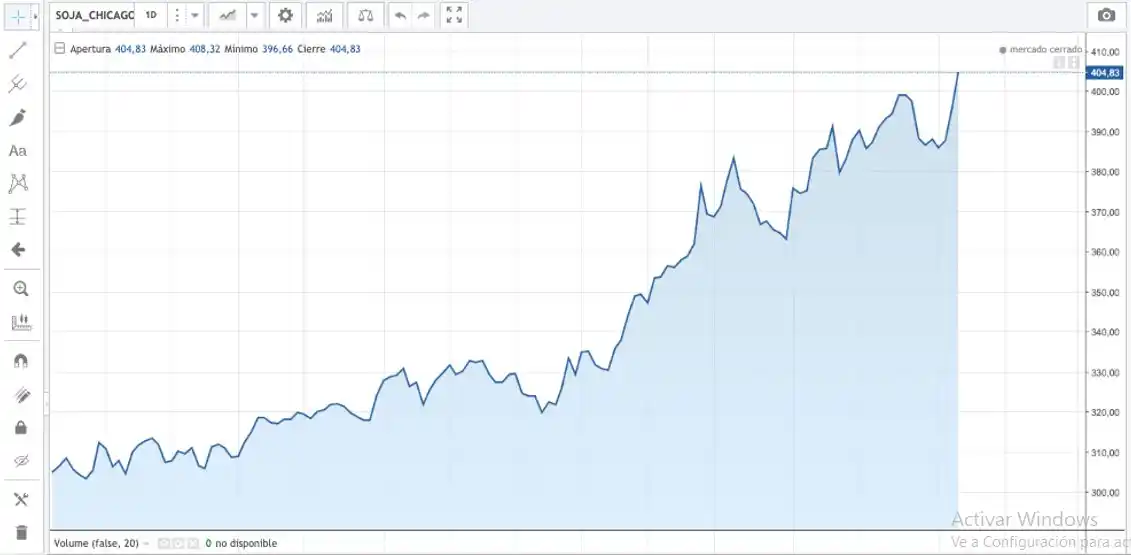 Los cereales y la soja han aumentado de manera constante desde mediados de año, impulsados por los gobiernos que apuntalan sus reservas en previsión de la interrupción de la segunda ola de la pandemia Covid-19. China ha sido un comprador particularmente activo ya que el país reconstruye constantemente sus conjuntos de cerdos a raíz de la devastación causada por la peste porcina africana. Las condiciones cálidas y secas en el sur de Brasil y Argentina como resultado del patrón climático de La Niña han golpeado la oferta de soja, elevando los precios negociados en Chicago, según el bróker Olymp Trade. Aquí puedes ver el gráfico de evolución de precios de soja en la bolsa de Chicago desde mayo de 2020 hasta la fecha, alcanzando actualmente un pico de $404,83 USD , 100 dólares más que a inicios de mayo de este mismo año. China, que ha vendido grandes cantidades de granos de sus reservas estratégicas desde mayo en un esfuerzo por frenar el aumento de los precios de los granos, necesitaba reponer sus existencias, dijo Wayne Gordon ,analista agrícola en UBS en Singapur, ya que se estaban acercando a niveles muy bajos. El amplio repunte de los precios de los alimentos durante la segunda mitad de 2020 ha atraído a los fondos de cobertura y otros compradores especulativos. Los últimos datos de la Comisión de Comercio de Futuros de Productos Básicos de EE. UU mostraron que en la semana que finalizó el 27 de octubre, los especuladores mantuvieron posiciones “largas” netas récord en futuros y opciones de productos básicos agrícolas. Por otro lado, los precios del maíz han experimentado una recuperación, ayudados por un déficit de cosecha en Ucrania causado por el clima seco, mientras que el trigo, que ha tenido una gran demanda de grandes compradores como Egipto y Marruecos en medio de una sequía en el norte de África, también ha tenido un repunte Por último, según informa el periódico El Economista, la Bolsa de Comercio prevé una caída en la cosecha a 46,5 millones de toneladas, desde los 49 millones de la campaña precedente, debido a condiciones más secas. La Bolsa explicó que los productores continuarán aguardando por las precipitaciones tras un invierno extremadamente seco en varias regiones agropecuarias, ya que dichas regiones aguardan por futuras lluvias que brinden fluidez a la siembra. Recordemos que la soja tuvo un valor récord el 27 de agosto de 2012 a $646 dólares por tonelada.