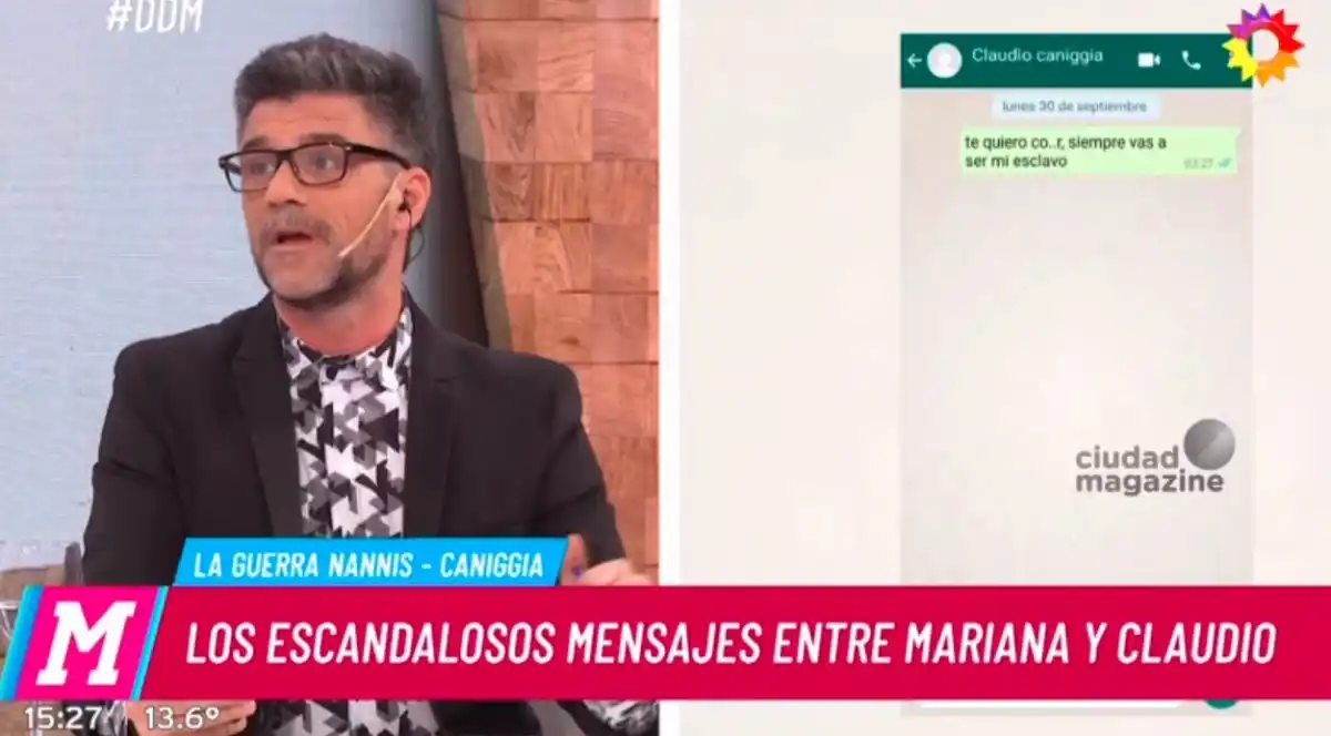 El enfrentamiento entre Mariana Nannis (55) y Claudio Caniggia (52) en el ámbito mediático y personal tuvo un giro inesperado en las últimas horas, luego del que el periodista Lucas Bertero contara en El Diario de Mariana los detalles de su charla con el exfutbolista. “Pude comunicarme con Claudio y tenemos recreados los chats que tuvo con Mariana, que fueron leidos de forma textual por él en una llamada telefónica”, anticipó el panelista. Entonces, puso en contexto el insólito material que instantes después mostrarían al aire: “Van a pedir la insanía mental de Mariana Nannis porque en dos oportunidades, luego del programa con Susana Giménez, el lunes 26 de agosto, y luego de ir al programa de la TV italiana, el lunes 30 de septiembre, le envió estos mensajes. Lo que quieren demostrar es que mientras lo acusa maltratador, mal padre y de estar con una prostituta, al mismo tiempo que lo quería reconquistar por chat”. En ese momento mostraron el mensaje que Mariana le habría mandado a Claudio un día después de acusarlo de violencia de género en el living de Susana: "Le mandó una foto hot y le dijo ‘tomá viagra y vení’”. La respuesta Caniggia a Nannis: “Me das vergüenza por todo lo que hiciste”. En el segundo mensaje, un día después de presentarse en Live - Non è la d'Urso, donde repitió las graves acusaciones, Mariana Nannis le habría dicho a su ex: “Te quiero cog…, siempre vas a ser mi esclavo”. En esta ocasión, Claudio Caniggia ya no contestó.