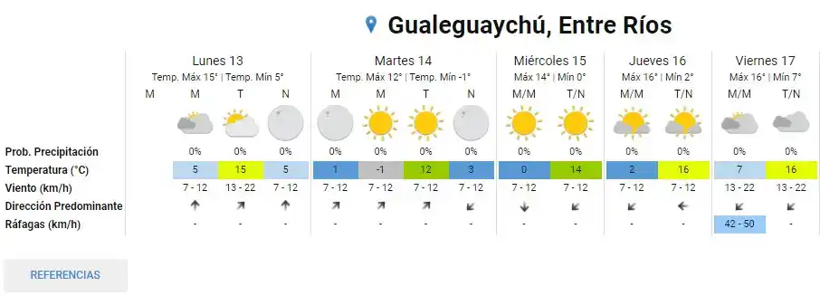 La mínima indicada por el Servicio Meteorológico Nacional para este primer día de la semana era de 5º, sin embargo se perforó esa marca y a las 8 de la mañana la temperatura fue de 0,7 ºC. Se espera para esta tarde cielo parcialmente nublado y un leve repunte de la temperatura hasta llegar a los 15ºC, y luego una noche muy fría con 5ºC. El frío no dará tregua mañana, ya que para este martes la mínima pronosticada es de un grado bajo cero, y la máxima apenas de 12ºC. Para el miércoles la temperatura más baja es de 0ºC, y la más alta será de 14ºC, según la proyección del SMN. El pronóstico extendido