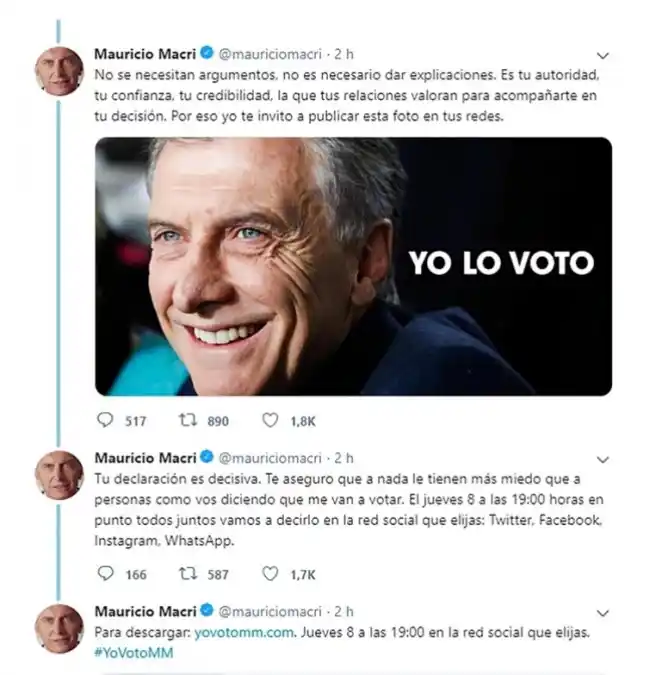 Cuando queda una semana para las Primarias Abiertas, Simultáneas y Obligatorias (PASO), una de las estrategias del oficialismo es alentar a que sus votantes participen de las elecciones del domingo que viene, y en un nuevo llamado a sufragar, el presidente Mauricio Macri les pidió a los electores de Juntos por el Cambio que hagan pública su decisión de optar por la coalición gobernante. En una serie de tuits publicados en su cuenta, Macri sostuvo que "decir públicamente a quién vas votar tiene un efecto inmediato sobre los demás. Tu declaración funciona como un cartel que fija una posición e invita a los otros a hacer lo mismo". El hilo de Twitter titulado "A NADA LE TIENEN MÁS MIEDO QUE A PERSONAS COMO VOS DICIENDO QUE ME VAN A VOTAR" el Presidente además sostuvo que "no se necesitan argumentos, no es necesario dar explicaciones. Es tu autoridad, tu confianza, tu credibilidad, la que tus relaciones valoran para acompañarte en tu decisión. Por eso yo te invito a publicar esta foto en tus redes". "Tu declaración es decisiva. Te aseguro que a nada le tienen más miedo que a personas como vos diciendo que me van a votar. El jueves 8 a las 19:00 horas en punto todos juntos vamos a decirlo en la red social que elijas: Twitter, Facebook, Instagram, WhatsApp",concluyó el Presidente. Mañana, Macri cerrará la campaña de Juntos por el Cambio en la provincia de Santa Fe con un acto en el Club Banco Nación de la ciudad de Rosario acompañando a los candidatos locales que señalaron que "los santafesinos van a decidir no volver al pasado".