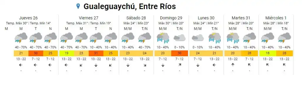 Luego de la madrugada tormentosa durante la madrugada del jueves, las malas condiciones del tiempo en Gualeguaychú y en la provincia se prolongarían varios días, incluso hasta el primer día de 2020. El mayor porcentaje de probabilidades de precipitaciones está señalado para hoy, para el viernes e inclusive el sábado: los tres días están pronosticados con altas chances de tormentas aisladas a lo largo de todo el día. Eso sí, las temperaturas máximas no bajarán y se mantendrán en el orden de los 30 grados. Luego del sábado podría darse una leve mejoría, pero seguiría la inestabilidad y la posibilidad de lluvias siempre latente. Según las previsiones a más largo plazo, recién después de Año Nuevo se produciría una mejoría más duradera en las condiciones meteorológicas.