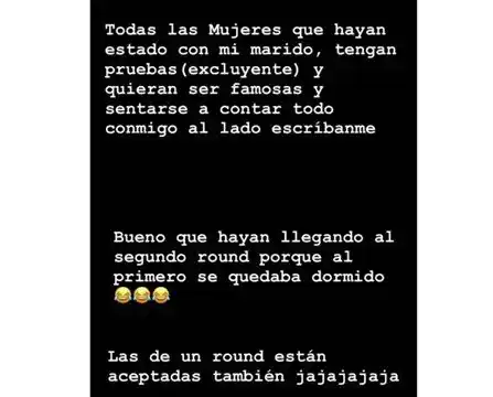 Lo hizo a través de su cuenta en Instagram. "Todas las mujeres que hayan estado con mi marido, y quieran ser famosas, escríbanme", propuso.