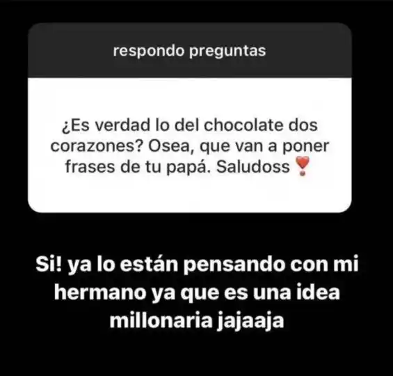 Dispuesta a charlar de todo con sus seguidores de Instagram, Martita Fort respondió a todas sus preguntas y sorprendió al confirmar que con su hermano, Felipe, homenajearán a su papá, Ricardo Fort, mediante una golosina. "¿Es verdad lo del chocolate Dos corazones? O sea, que van a poner frases de tu papá...", le consultaron a través de sus stories. Entonces, Martita dijo que sí; dentro del corazón de chocolate de la marca de la familia, en vez de añadir poemas de amor, quienes compren la golosina podrán encontrar las declaraciones más recordadas del querido empresario. "Sí, ya lo están pensando con mi hermano. Es una idea millonaria ja, ja, ja", cerró, buena onda.