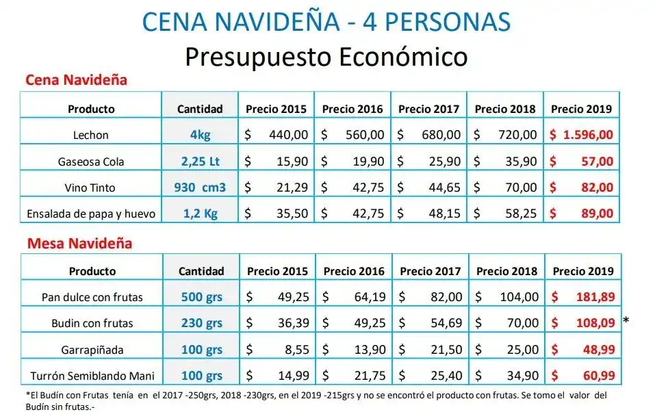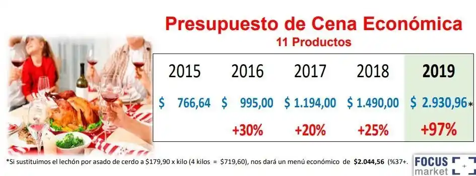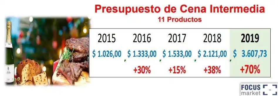 La canasta navideña llega este año con aumentos en sus productos que rondan entre el 50% y el 70% y hasta un máximo de un 97%, según el estudio realizado por la consultora Focus Market. Para el informe se buscaron los alimentos con mayor demanda en relación a la elección del menú para la cena navideña de los argentinos. Además, se tomó en cuenta tres presupuestos, que comprenden 11 productos cada uno, que van desde el “económico” al “premium”. Según el informe, el 25 por ciento de los argentinos prefieren llevar a sus mesas un buen asado, mientras que el 24% remarcan la importancia de una picada perfecta. Muy por detrás, se encuentra aquellos que prefieren el cerdo (9%), Pizza (3%), pescados (3%) o pastas (2%). Presupuesto económico El informe tuvo en cuenta una canasta básica para cuatro personas, comenzando con un cena económica que comprende lechón de 4kg (de $1.596), en caso del asado la suma alcanzaría los $719, una gaseosa 2.25L ($57), vino tinto ($82) y una ensalada de papa y huevo ($89). Además, se basa en los productos de la típica mesa navideña como el Pan Dulce ($181,89), budín con frutas ($108,09), garrapiñada ($48,99) y turrón ($60,99). Para el brindis, se basó en un espumante de ananá de $99 y una sidra de $69. Finalmente para el postre se tomó un 1,5 kg de helado cuyo valor estima en $539. Este costo en conjunto da una suma de $2.930, 96 que representa un 96% de aumento con respecto al año pasado, cuyos productos combinados sumaban solamente $1.490. Según detalla el informe, el presupuesto económico representa el aumento más drástico, ya que casi duplica la inflación. El especialista en consumo y director de Focus Market, Damián Di Pace, le dio una entrevista a Radio Mitre y analizó que “se vienen aumentos muy fuertes, algunos están sobre la interanual de inflación del 50%”. Asimismo, aclaró que “es un sector que tiene una estacionalidad muy alta”. En ese contexto, Di Pace remarcó que “los empresarios empezaron a producir en el mes de octubre, cuando no se sabía cómo iba a ser el tipo de cambio futuro ni la inflación“. “En el caso del pan dulce los frutos secos se mueven a valor dólar y se ajustó a dólar en $70”, agregó. En ese sentido, expresó que “lo que puede llegar a pasar es que sobre ese precio haya descuentos en listas de precios u ofertas en caso de que el pan dulce no traccione lo suficiente para mover volumen”. “Hasta el 25 de diciembre tenés un precio. Después hay ofertas para el 31”, mencionó. Presupuesto intermedio Para el presupuesto intermedio de once productos, se tomó en cuenta una cena con: Asado de novillo de 4Kg ($1.460), gaseosa de 2,25L ($137), vino tinto ($160) y ensalada de papa y huevo ($90). Para la mesa navideña, el pan dulce alcanzó los $329,55; el budín de chocolate ($100,99); garrapiñada ($79,19) y el famosos turrón alcanzó un valor de $156. Para el brindis, el espumante pasó a ser uno de mejor calidad con un precio de $225 y el Champagne Marca Lider elegido tiene un valor de 370 pesos. Por último, el helado de 1Kg artesanal sale en el mercado unos $500. El cálculo de todos estos productos representa la suma de $3.607, 73, la cual equivale al 70% de aumento con respecto al año 2018 ($2.121). Presupuesto premium Por último está el análisis del presupuesto Premium, que tuvo en cuenta productos de alto valor y que no muchas familias elegirían. Entre ellos se encuentran: Peceto de Novillo de 4Kg ($1.400); Gaseosa Cola 2.25L ($137); Vino Tinto ($1.056); Ensalada de papa y huevo ($96); Pan dulce, Almendras, Avellanas, Nueces, Frutas ($900); Stollen con almendras, pasa y naranjas ($500); Torta de Frutos Secos ($635); Turrón español blando de manì ($440); Sidra Premium ($260); Champagne Premium Alta Gama ($1.050) y el Helado Artesanal de 1Kg de $750. Este combo de 11 productos “Premium” tuvo un valor – según Focus Market- de 6.909 pesos. O sea, un más del 55% de aumento con respecto a lo que salía el mismo combo el año pasado ($4.463,35). Di Pace se refirió al cambio del cálculo del ABL en Capital Federal. “El ABL estaría ajustando cinco meses previos en el mes de agosto de 2019 y seguiría ajustando mes a mes”, dijo mientras que añadió que “es verdad que al tomar la inflación pasada el gobierno logra mayor previsibilidad”. Y sostuvo que “si tomamos el ajuste del ABL de 2019 con esta nueva fórmula, el ABL se ajustó 34% y la inflación va a terminar en el 55%. Por lo cual si esta ley se hubiese sancionado el año pasado los porteños estarían pagando en forma mensual más ABL del que pagaron en enero de 2019”.