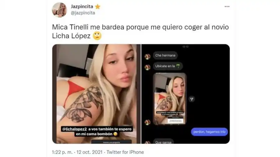 Micaela Tinelli protagonizó un picante cruce con Jazpincita, una actriz porno conocida por su contenido en OnlyFans. La modelo invitó a Lisandro Licha López a su cama y la empresaria no lo dejó pasar y la increpó en privado, pero la joven la escrachó. La hija mayor de Marcelo Tinelli y Soledad Aquino es conocida en el medio por cultivar un bajo perfil. Sin embargo, quienes la conocen saben que es tan picante como su hermana Cande si la buscan. Y prueba de ello fue su cruce con la modelo Jazpincita, quien invitó a Licha López, novio de la empresaria de la moda desde 2019, a su cama. Sin sutilezas. "Mica Tinelli me bardea porque me quiero cog*** al novio Licha López", escribió Jazpincita en su cuenta de Twitter junto a las capturas de su cruce en Instagram. "A vos también te espero en mi cama bombón", expresó la joven arrobando al futbolista en una historia de Instagram en medio de las preguntas que respondía de sus seguidores. Qué le dijo Mica Tinelli a Jazpincita por Licha López Tras enterarse, Mica Tinelli le respondió a Jazpincita a través de los mensajes privados de Instagram. "Che, hermana. Ubicate en la palmera", le puso la hermana de Cande Tinelli. Lejos de amedrentarse, Jazpincita, quien buscaba tener mas notoriedad después de publicar un chat con Cristian Pavón, respondió: "Perdón, hagamos trío". "Que gansa", replicó Mica. En otro tramo del chat, la hija de Marcelo Tinelli le dijo "Las chicas como vos restan. Te mando un beso, que sigas bien". "¿Una Tinelli me lo viene a decir a mi? Por favor, me río sola", lanzó Jazpincita en el chat privado que luego publicó en su cuenta de Twitter. "Sí. A vos que te metes con pibes con novias. Sos lo menos, no importa el apellido, sos una pobre piba", escribió la empresaria visiblemente enojada. Provocativa, buscando repercusión, la actriz porno le dijo: "¿Es joda? ¿Me metí con tu novio? No". "No, pero te haces la canchera", cerró el tema Mica Tinelli. Mica tuvo un apoyo generalizado en las redes. Entre los mensajes, una usuaria le dijo: "Hermana ubicala por atrevida de mierd*". "Ahora me escribe medio planeta porque la mina sube mis mensajes. gracias (?) jajajaja", le contesto Mica con emojis de risas.