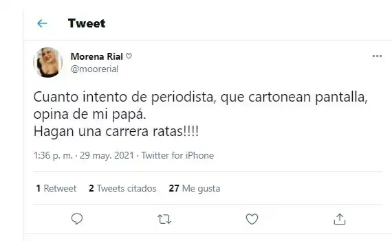 Morena Rial utilizó sus redes sociales para defender a su papá, Jorge Rial, en este duro momento de su carrera periodística. La cantante le demostró su apoyo al conductor, quien anunció sorpresivamente el último viernes su renuncia a TV Nostra y el fin del ciclo televisivo, a dos meses del debut. "Cuánto intento de periodista que cartonean pantalla y opina de mi papá. Hagan una carrera, ¡¡¡ratas!!!", expresó More en su cuenta oficial de Twitter, este sábado. La arremetida 2.0 de la hija de Rial llamó la atención y generó polémica después de que Ángel de Brito entrara en escena dándole "me gusta" a fuertes comentarios sobre Jorge y su "fracaso" en TV. Morena también posteó algunas imágenes de su papá con Francesco Ambrosioni en su Instagram, donde le dedicó unas palabras de aliento: “Ellos. Te amamos Tatita, siempre con vos”. La noticia del conductor causó revuelos en el mundo digital y la joven no dudó en disparar contra quienes opinaron sin filtro acerca de Jorge Rial. El ciclo nocturno de América llegó a su fin a menos de dos meses de haber iniciado. “Tomé la decisión de terminar Tv Nostra. Tendré que revisar qué hice hasta ahora, bien y mal. Podría poner mil excusas, que es lo más fácil. No hay culpas. Fue una responsabilidad mía. Debo reconocer que tuve mucho miedo durante la pandemia, me sacó energía”, dijo en la última emisión.