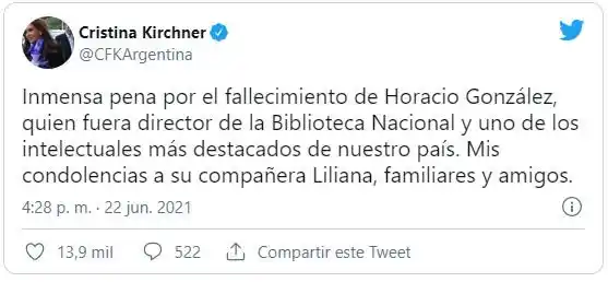 El exdirector de la Biblioteca Nacional y creador de “Carta abierta”, Horacio González, internado hace más de 30 días con coronavirus, murió hoy a los 77 años, según confirmaron allegados del ensayista y sociólogo. Diez días atrás, su pareja, la cantante Liliana Herrero, informó que la salud del exdirector de la Biblioteca Nacional estaba “más frágil” y que le habían tenido que colocar un respirador. “En la dura pelea contra el Covid y sus consecuencias, hoy Horacio González está más frágil: tuvieron que volver a colocarle el respirador y está sedado”, escribió la cantante en su cuenta de Instagram en aquella oportunidad. El martes, los usuarios de las redes sociales compartieron mensajes de lamento y enviaron sus condolencias a la familia del reconocido ensayista. Entre ellos, el presidente Alberto Fernández despidió al exdirector de la Biblioteca Nacional y destacó su aporte cultural. “Lamento profundamente la partida de Horacio González, ex director de la Biblioteca Nacional. Fue un intelectual comprometido con la realidad de su patria y con las causas justas. Valoro el inmenso aporte que nos ha dejado. Mi abrazo para Liliana Herrero y quienes lo han querido”, manifestó el Presidente por Twitter. La vicepresidenta Cristina Kircher también expresó su dolor y le dio su pésame a Herrero. “Inmensa pena por el fallecimiento de Horacio González, quien fuera director de la Biblioteca Nacional y uno de los intelectuales más destacados de nuestro país. Mis condolencias a su compañera Liliana, familiares y amigos”, escribió por Twitter. Por su parte, el exvicepresidente Amado Boudou manifestó desde su cuenta de Twitter: “Tremenda tristeza. Estarás siempre! Fuertísimo abrazo Liliana”. Sociólogo, docente y ensayista argentino nacido en 1944, González era uno de los referentes intelectuales del pensamiento nacional cercano al peronismo. Sus análisis sobre literatura y política -y su rol como fundador de Carta Abierta- contribuyeron significativamente a cultivar lecturas críticas y comprometidas de la realidad. Entre los libros que publicó se cuentan La ética picaresca (1992), La realidad satírica. Doce hipótesis sobre Página/12 (1992), Arlt: política y locura (1996), Retórica y locura. Para una teoría de la cultura argentina (2003), Paul Groussac: La lengua emigrada (2007), Kirchnerismo, una controversia cultural (2011), Lengua del ultraje. De la generación del 37 a David Viñas (2012) y la novela Besos a la muerta (2014).