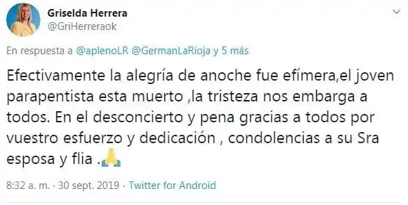 La esperanza de rescatar con vida al parapentista Claudio Kegalj terminó de desvanecerse esta mañana. El hombre de 50 años había desaparecido en una zona montañosa de La Rioja y fue hallado con vida el pasado domingo en un punto de difícil acceso. Por ese motivo, el rescate demoró varias horas y cuando pudieron alcanzar al santafesino, éste estaba fallecido. El triste desenlace fue confirmado por la secretaria General de Gobernación de la provincia de La Rioja, Griselda Herrera, a través de un tuit: "La alegría de anoche fue efímera. El joven parapentista está muerto. La tristeza nos embarga a todos. En el desconcierto y pena, gracias a todos por vuestro esfuerzo y dedicación. Condolencias a su señora esposa y a la familia". Kegalj desapareció el pasado viernes durante un vuelo que hizo con unos amigos por la zona de Famatina y Chilecito, uno de los lugares predilectos por los aficionados de ese deporte. El grupo logró completar la expedición y tocar tierra en un punto conocido como "Cuesta Nueva", con excepción de Kegalj. Sus compañeros alertaron a la policía de La Rioja y comenzó el operativo de búsqueda que culminó alrededor de las 20 del pasado domingo cuando un equipo de rescate logró divisar al hombre en una zona de alta montaña de difícil acceso. De acuerdo lo informado por las autoridades en ese momento, el hombre oriundo de Venado Tuerto movió uno de sus brazos mientras colgaba de su parapente. Sin embargo, el clima y la superficie rocosa imposibilitaron el rescate por vía área, por lo que prepararon un operativo terrestre que debió postergarse hasta el amanecer de este lunes. Al llegar al lugar, los médicos constataron que Kegalj perdió la vida porque no soportó tantas horas a la intemperie. Su cuerpo será sometido en las próximas horas a una autopsia para determinar con exactitud las causales de muerte.