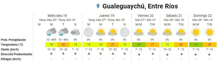 Este miércoles la ciudad arrancó bajo la niebla, con una visibilidad que no superó los 3,5 km. Persisten las probabilidades de lluvias aisladas durante la mañana y la tarde, con temperaturas que no superarán los 25ºC. El Servicio Meteorológico Nacional prevee que el tiempo mejore el jueves, con cielo algo nublado y despejado, y con temperaturas que oscilaran entre los 15 y 27ºC. El pronóstico extendido: