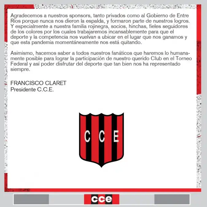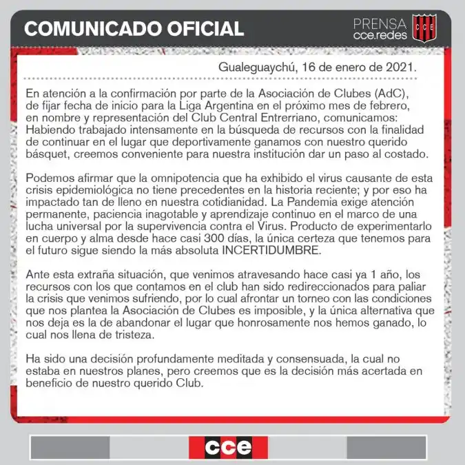 A través de un comunicado oficializado en sus redes, Central Entrerriano confirmó que no será parte de la temporada 2021 de la Liga Argentina. La intención de los dirigentes es jugar el Torneo Federal.