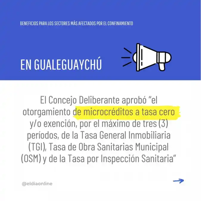 Este viernes el Gobierno provincial informó que “se concretó el diferimiento de tributos para actividades afectadas por el confinamiento dispuesto en los últimos días”. Tal como lo adelantó el gobernador Gustavo Bordet, la provincia concretó el diferimiento de tributos para actividades afectadas por las medidas de confinamiento dispuestas en los últimos días. Dicha medida se suma a las herramientas de apoyo dispuestas para los sectores de la economía que han visto restringido su accionar durante la pandemia. El nuevo decreto, que lleva el número 1140, contempla una ampliación del vencimiento para obligación con fecha hasta el 31/08/2021 con chance de pago al 31/12/2021, para los rubros deportes, cultura, turismo, gastronomía y transporte de pasajeros. El ministro de Producción, Juan José Bahillo, expresó al respecto que la norma faculta a su cartera a incorporar nuevas actividades a las incluidas en el decreto. También faculta a la ATER a extender la fecha de diferimiento e incorporar nuevos períodos a solicitud del Ministerio de Producción, debido a la eventual continuidad de la emergencia epidemiológica, y a dictar las normas complementarias que resulten necesarias para instrumentar las medidas dispuestas en el decreto. El decreto contempla la condonación de las multas e intereses por incumplimiento, o cumplimiento fuera de término, del pago de las obligaciones tributarias cuyos vencimientos originales operaron entre el 01 de febrero y el 31 de mayo de 2021, en tanto se ingresen y/o regularicen hasta el 31 de diciembre de 2021. ¿Qué es el programa Acompañar? “La situación sanitaria es la peor desde que se declaró la emergencia por la pandemia del coronavirus, a principios del año pasado”. Esta afirmación fue realizada por el propio presidente de la Nación Alberto Fernández, en base a las cifras de ocupación hospitalaria, contagiados y fallecidos a causa de la enfermedad. En este sentido, desde el Municipio indicaron que “Gualeguaychú no es ajena a esa realidad, sino todo lo contrario. En la ciudad también se transita el peor momento de estos 14 meses”. En este marco, el Concejo Deliberante modificó la ordenanza que, el año pasado, puso en vigencia el programa “Acompañar”. Por pedido del concejal Hernán Ayala (PJ-Creer), se amplió el temario dispuesto para la sesión y se le dio ingreso al Expediente 6.854/21, el cual modifica el programa “Acompañar”. “Este programa previó, desde el año pasado, microcréditos a tasa cero para comerciantes y la exención de las tasas municipales por el período de tres meses. Ahora, a través de esta ordenanza pretendemos empezar a otorgar, de manera focalizada, aportes no reintegrables a aquellos sectores más perjudicados por las restricciones”, presentó el legislador. En este sentido, el Artículo N°1 de la norma aprobada por unanimidad establece “el otorgamiento de microcréditos a tasa cero y/o exención, por el máximo de tres (3) períodos, de la Tasa General Inmobiliaria (TGI), Tasa de Obra Sanitarias Municipal (OSM) y de la Tasa por Inspección Sanitaria Higiene Profilaxis y Seguridad y/o aportes no reintegrables, el otorgamiento será con sujeción a requisitos y dependerá del análisis de situación económico y financiero de la autoridad de aplicación.” Esta modificación autoriza al Departamento Ejecutivo Municipal, además de otorgar microcréditos a tasa cero y exenciones al pago de tasas, a promover “aportes no reintegrables tendientes a minimizar la presente crisis económica”. Las disposiciones de la ordenanza, acompañada por los trece concejales que conforman el cuerpo legislativo, tendrán vigencia hasta el día 31 de diciembre de 2021. Aunque, dicho plazo podrá ser prorrogado de acuerdo al avance de la situación epidemiológica local y de las medidas que se dispongan en el marco de la emergencia sanitaria.
