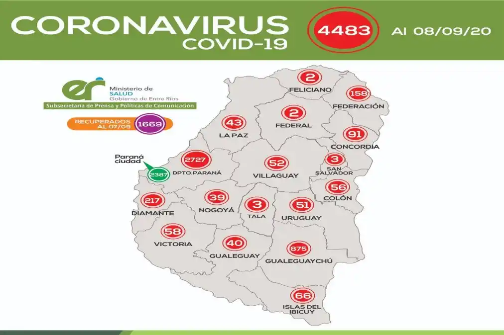 Los nuevos contagios se distribuyen departamentalmente de la siguiente manera: -Paraná : 84 -Gualeguaychú: 30 -Diamante : 22 -Villaguay : 7 -Nogoyá : 3 -Federación : 1 -Concordia : 1 -Colón : 1 -Uruguay : 1 De ese modo, en la provincia son 4.483 los casos confirmados. LOS NÚMEROS DEL HOSPITAL CENTENARIO El Nodo de Epidemiología del Hospital Gualeguaychú ha confirmado 889 casos de Covid-19 hasta el momento en el departamento, de los cuales 409 son casos activos y 114 se encuentran en estudio. Departamento Gualeguaychú Confirmados totales: 889 Activos: 409 Descartados: 1261 Sin nexo: 44 % Contacto estrecho de caso positivo: 55 % Viaje a zona de circulación comunitaria: 1 % Confirmados por nexo: 172 Recuperados 469 Fallecidos: 11 Casos en estudio: 114 Casos por Localidades: Confirmados / Activos Gualeguaychú: 823 / 351 Pueblo Belgrano: 10 / 7 Larroque: 32 / 27 Urdinarrain: 23 / 23 Pehuajó: 1 / 1