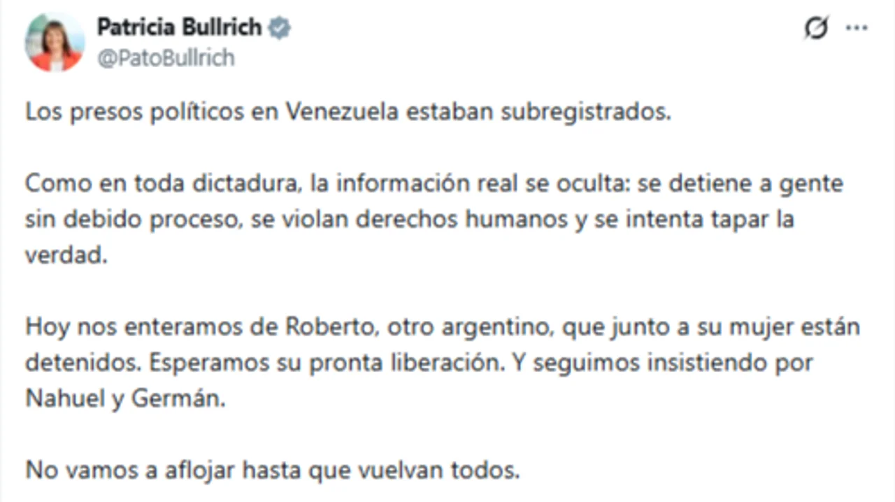 La presidenta del bloque de senadores nacionales de La Libertad Avanza (LLA), Patricia Bullrich, anunció este jueves que existe otro argentino detenido por el Gobierno de Venezuela, Roberto Baldo, quien se suma al gendarme Nahuel Gallo y Germán Giuliani.