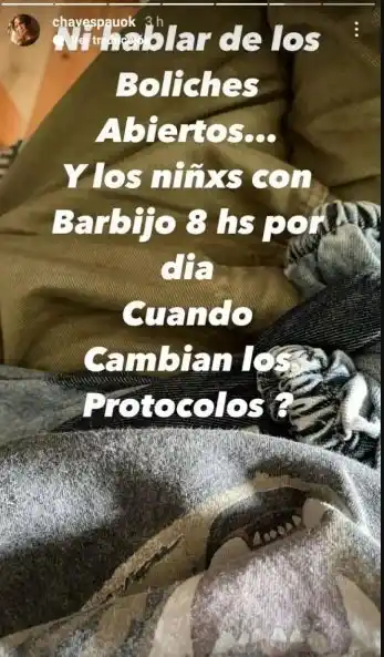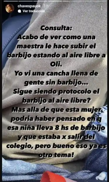 Atenta a la crianza de sus hijos, Paula Chaves vio en el colegio de su hija Olivia una situación que no le gustó e hizo un fuerte descargo a través de sus stories de Instagram. Sorprendida por la actitud de una maestra que le pidió a Olivia que se pusiera el barbijo al aire libre, la conductora dijo lo suyo. "Consulta: acabo de ver cómo una maestra le hizo a Oli subirse el barbijo estando al aire libre. Yo vi una cancha llena de gente sin barbijo... ¿Sigue siendo protocolo el barbijo al aire libre? Más allá de que esta mujer podría haber pensado en que ese niña lleva ocho horas de barbijo y que estaba por salir del colegio, pero bueno... Ese es ya otro tema", expresó, tajante. En la misma línea, volvió a consultar cuándo se flexibilizará el protocolo y deslizó que está en desacuerdo con la apertura de los boliches. "Ni hablar de los boliches abiertos y de los niños con barbijo durante ocho horas por día... ¿Cuándo cambian los protocolos?", cerró, un tanto molesta.