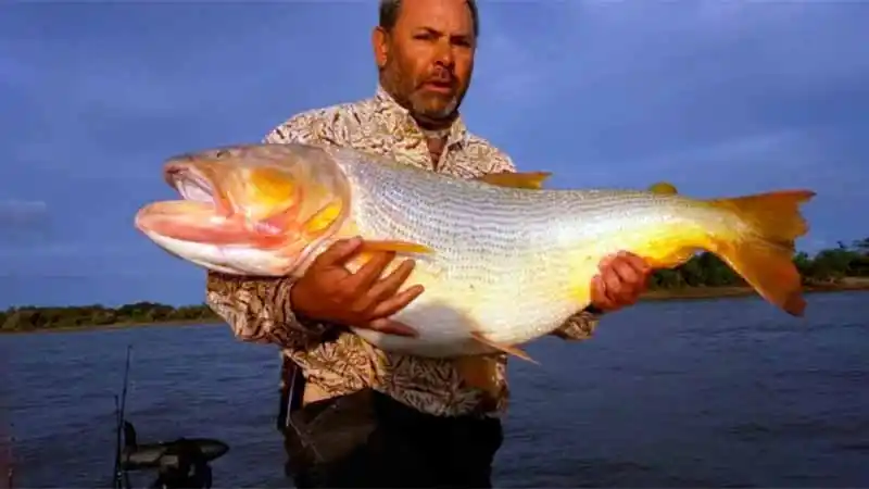 Sucedió este domingo a las 8 de la mañana, en Esquina, provincia de Corrientes. Trece cordobeses pescaban en aguas del Río Paraná y tardaron 25 minutos en lograr capturar al gran ejemplar de dorado que pesó 24 kilos y casi un metro de largo. Con la modalidad camalote, Miguel Rovera de Río Cuarto Córdoba, fue quién lo pescó. Carlos Alcalá contó al sitio Actualidad Esquina, que luego de fotografiarlo, el dorado de 24 kilos fue devuelto al río. Asimismo, el feliz pescador, señaló que haber pescado el enorme dorado, fue "un sueño hecho realidad" porque "desde muy chico" practica la pesca deportiva y "es la primera vez" que pudo obtener "tan lindo trofeo".