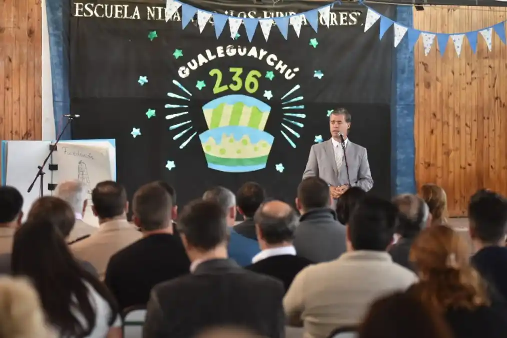 Con la presencia de autoridades provinciales, municipales, fuerzas de seguridad, educativas, alumnos de la Escuela Nº 88 y de la Tomás de Rocamora, se realizó en el salón de acto del recinto escolar de Los Fundadores el acto oficial por el 236 aniversario de Gualeguaychú, el cual fue concluido por el intendente Martín Piaggio. “Todos tenemos responsabilidades en el devenir del presente y el futuro de nuestra amada ciudad, responsabilidades que nos invitan a trabajar en virtud de nuestros sueños, pero para eso es fundamental el compromiso: tenemos que bregar por una ciudad más justa, con más oportunidades para todos, pensando en lo que vienen, para lo cual hay que trabajar en la inclusión, la diversidad, el respeto y en la no violencia de todo tipo. Y para eso, en un nuevo aniversario de la ciudad, todos queremos ratificar nuestro compromiso con un nuevo despertar en una comunidad en paz. Es el gran desafío que todos tenemos que hoy ratificamos en un día festivo”. “Nadie, en el día de hoy, debe olvidarse que nuestro pueblo existía antes de la fundación formal del 19 de octubre de 1783, y que se encontraba en la zona sur. En realidad desde Puerto Landa avanzando hacia la zona sur, en uno de los lugares más bellos de la región”, sostuvo Piaggio. Aludiendo la figura de Fray Mocho, agregó que “seguimos trabajando en el rescate de su casa, que en poco tiempo será un lugar de la cultura de Gualeguaychú, abriendo sus puertas como la Casa del Nuevo Museo de Fray Mocho, y que los vecinos podamos contar con ese lugar”. Y sobre el lugar donde se erigieron los cimientos de la actual Gualeguaychú, afirmó que “fue muy valioso el rescate de esta zona, cuando decidimos darle valor a la Plaza de los Antepasados, a la Escuela Los Fundadores y la capillita. Teniendo esto en cuenta, tenemos que festejar el cumpleaños de la ciudad con una fiesta popular. Todo esto fue un antes y un después con respecto al uso que toda la barriada le puede dar a los espacios públicos, un hito que nos propulsó a la recuperación de todos los demás”. “No hay orgullo más grande que sentirnos parte de esta hermosa y querida Gualeguaychú”, concluyó el Intendente.