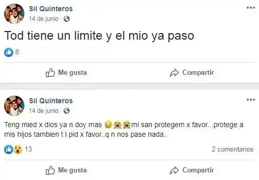 Silvia Quinteros (28) había escrito varias veces en su perfil de Facebook que "tenía mucho miedo" de que algo le sucediera. Días después desapareció, por lo que dispusieron rastrillajes en los cuales encontraron su cuerpo abandonado en un descampado en la localidad santafesina de Herisilia. Su ex pareja, Javier Piedrabuena (31), quien tenía un restricción de acercamiento, está detenido. La fiscal a cargo de la causa, Silvina Verney, confirmó este miércoles que los restos de Quinteros fueron hallados al atardecer del pasado martes en un descampado cercano a la localidad de Hersilia, durante un rastrillaje efectuado por personal de la Policía de Investigaciones y de la Agencia de Trata de Personas. El cadáver de Quinteros estaba cubierto con ramas y semienterrado en una campo conocido como "Viejo Vivero", adyacente a la Ruta Nacional 34, a unos 270 kilómetros al noroeste de la capital provincial y cercana a la frontera con Santiago del Estero. Tras el hallazgo, el cuerpo fue remitido a la morgue, donde en las próximas horas realizarán la correspondiente autopsia para determinar las causas de la muerte. Quinteros era madre de tres chicos de 6, 9 y 10 años y estaba separada de su pareja y padre de los menores, Piedrabuena. El hombre tenía una restricción perimetral impuesta por la Justicia, la cual había violado varias veces, según denunció la mujer en sus redes sociales días antes de desaparecer el pasado 1 de agosto y ratificaron luego los pesquisas. Piedrabuena no sólo tenía prohibido acercarse a su ex pareja sino también a sus hijos. Según manifestó Quinteros en sus redes sociales, le tenía "mucho miedo". El 14 de junio último, en su Facebook, la mujer escribió: "Tengo mucho miedo, por favor mi San La Muerte protegeme". Unos días después, el 22 de junio, Quinteros publicó de nuevo en el mismo sentido: "Tengo que vivir con miedo siempre de saber que tengo que tener ojos en la espalda para ver que no me pase nada, que no me lastimes ni a mí ni a mis hijos. Ni la restricción te para, hasta donde fuiste capaz de llegar". Piedrabuena está detenido desde hace varios días en base a testimonios y demás elementos en que surgieron sospechas sobre su participación en la desaparición de su ex mujer, ahora hallada asesinada, por lo enfrentará una acusación por femicidio. Fuentes del caso agregaron que al momento de ser denunciada la desaparición de Quinteros, allegados a la familia revelaron que había habido una fuerte discusión con su ex pareja, por lo cual se inició su búsqueda de inmediato. Voceros del Ministerio Público de la Acusación además señalaron que Quinteros y Piedrabuena tenían una audiencia de conciliación prevista para la jornada de este miércoles.