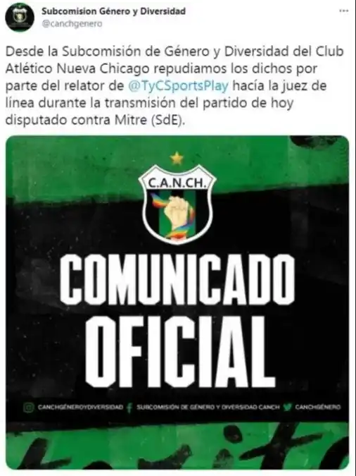 Las redes sociales estallaron durante el encuentro que terminó con la victoria de Mitre sobre Nueva Chicago, a raíz de un poco profesional comentario que el relator de TyC Sports, Ramón Ávila, le dedicó a la juez asistente Mariana Duré, durante los minutos finales del primer tiempo del partido. “Ahí está, qué linda, buena presencia, ¿no? de la árbitro asistente...”, comentó Ávila cuando las cámaras enfocaron a la asistente. Y como si es no fuera suficiente, agregó: “¡Epa! se congeló la cámara allí por parte de uno de los camarógrafos. Había un jugador... Duré, ¿no? bah, capaz que sea pariente”. Lejos de centrarse en el partido, el relator dejó en todo momento el ojo puesto en Duré y cada acción del encuentro era la excusa perfecta para referirse de manera libidinosa a ella. Por ejemplo, en un avance de Mitre, comentó: “Viene el centro desde la izquierda de Sayavedra, se queda corto, el rechazo de Barrios, no se fue el peligro para Nueva Chicago pero había offside de Sayavedra. Para mí que se encandiló con el árbitro asistente 2.... Había un Duré, me acuerdo, un delantero rubio que jugó en Vélez y en All Boys. Nos desconcentramos con el árbitro asistente, ya después me va a decir el nombre y apellido, consiga teléfono también”. Por estos comentarios, Ávila se ganó el repudio de gran parte de los internautas que observaron de cerca la transmisión y de la Subcomisión de Género y Diversidad de Chicago, la cual emitió un comunicado en repudio a los dichos del relator: “Desde la Subcomisión de Género y Diversidad del Club Atlético Nueva Chicago repudiamos los dichos por parte del relator de @TyCSportsPlay hacía la juez de línea durante la transmisión del partido de hoy disputado contra Mitre (SdE)”. A través de su cuenta oficial, la Subcomisión de Género y Diversidad de Chicago agregó que "el acoso verbal tanto en nuestra institución como en todos los ámbitos debe ser rechazado”. Ante la gran repercusión que tuvo su gesto, Ávila decidió romper el silencio y a través de un comunicado le pidió sus "sinceras disculpas" a Mariana Duré. "Rectifico todos y cada uno de los dichos referidos a su persona que pudieran considerarse lesivos a su honor o su dignidad", dijo. Y sumó: "Muy lejos estuvo ello en mi intención o aspiración. Mi intención siempre fue denotar el contraste, que otorga el toque femenino en una terna arbitral a la que se nos tiene acostumbrado estar compuesta por mayoría masculina. Incluso durante la transmisión en cuestión, hice referencia a su buena actuación y he ponderado el lugar que se viene ganando la mujer en el fútbol, en el deporte y en la sociedad por su lucha en cuanto a la igualdad de oportunidades". El encuentro finalizó 1 a 0 a favor de los santiagueños sobre el Torito de Mataderos gracias al gol convertido por Rodrigo Sayavedra durante la primera mitad en el Estadio Madre de Ciudades en el partido correspondiente a la Primera Nacional. En la próxima fecha, Mitre enfrentará a Almirante y Chicago, que no puede salir del fondo de la tabla, recibirá a Atlanta, que viene de perder el clásico con Chacarita. El comunicado completo de Ramón Ávila En función de los comunicados, comentarios y publicaciones que se viralizaron recientemente en diversas redes sociales, quiero expresar públicamente mis sinceras disculpas al árbitro asistente 2, Mariana Duré, que jugó el domingo pasado, en el partido de fútbol entre el Club Atlético Mitre y el Club Atlético Nueva Chicago, por la Primera Nacional, frente a mis dichos realizados, durante la transmisión por el streaming de TyC Sports Play. Rectifico todos y cada uno de los dichos referidos a su persona que pudieran considerarse lesivos a su honor o su dignidad. Muy lejos estuvo ello en mi intención o aspiración. Mi intención siempre fue denotar el contraste, que otorga el toque femenino en una terna arbitral a la que se nos tiene acostumbrado estar compuesta por mayoría masculina. Incluso durante la transmisión en cuestión, hice referencia a su buena actuación y he ponderado el lugar que se viene ganando la mujer en el fútbol, en el deporte y en la sociedad por su lucha en cuanto a la igualdad de oportunidades. Tampoco pretendo verme involucrado en polémicas mediáticas o en odios anónimos en las redes sociales. Muy lejos estoy de aquello. Aunque por supuesto, me pregunto si por vía del absurdo, ¿qué podría decirse si -lejos de recibir halagos- la señorita jueza de línea hubiera recibido un insulto? ¿O un reproche ante un error en su arbitraje o fallo? ¿Es género, es discriminación, o apreciación periodística? No, señores y señoras, la terna arbitral es la autoridad máxima del encuentro y tiene la potestad de manejar la policía en el campo de juego y sus adyacencias. Puede tomarse como descortesía, sí. Podría tomarse como insulto, tal vez. Pero no como acoso porque la situación de la jueza de línea no es vulnerable. Es autoridad. De no ser así, y a partir de entonces, cualquier insulto en la cancha sería discriminación.