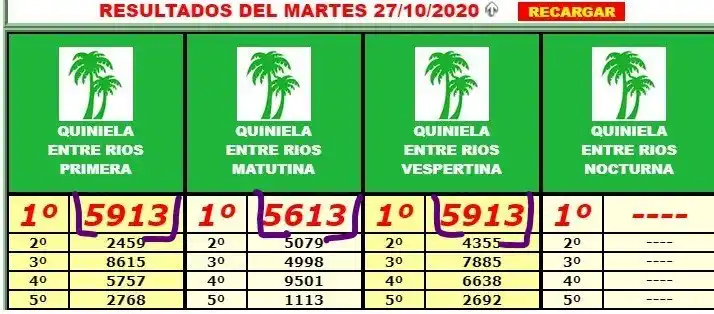 Creer o reventar: los tres primeros sorteos del martes 27 de octubre de 2020 de la Quiniela de Entre Ríos tuvieron prácticamente las mismas cuatro cifras en el primer puesto. En la Primera salió premiado el 5913, en la Matutina el 5613 y en la Vespertina volvió a repetirse la misma cifra del primer sorteo: 5913. De esta manera, se repitieron las cuatro cifras ganadoras en dos jugadas, y las dos últimas cifras, el 13, salió a la cabeza en los tres. ¿Pasará algo similar en la nocturna? Y lo más importante: ¿Habrá alguien que haya pegado el batacazo?