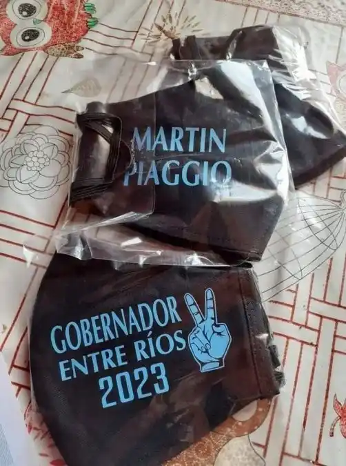 Pero no era cualquier parafernalia, sino que estaba decorado con una propuesta específica, para un cargo Ejecutivo y una elección en particular. Los elementos en cuestión son unos tapaboca color negros que en uno de sus lados dice con letras azules “Martín Piaggio”, y del otro, con la misma tipografía, “Gobernador Entre Ríos 2023”, acompañado todo con una mano con los dos típicos dedos en “V”.
