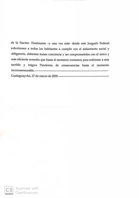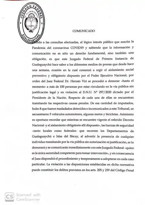 "Debemos tomar conciencia y ser comprometidos", pide en uno de sus párrafos finales el comunicado que, este viernes, envió a ElDía el Juzgado Federal de Gualeguaychú e Islas del Ibicuy a cargo del magistrado Hernán Viri. Pero, más allá que la inmensa mayoría de los ciudadanos está haciendo lo que tiene que hacer y cumple con el aislamiento domiciliario, precisamente no es el compromiso con el prójimo el que moviliza a los muchos que, todos los días, incumplen la cuarentena. Y, en definitiva, ponen a toda la población en peligro. Este viernes se cumplieron los primeros siete días desde que el presidente de la Nación Alberto Fernández decretó el aislamiento total y obligatorio en todo el territorio argentino. Y en este marco, ante la creciente demanda de información, no sólo de los medios de comunicación sino también de la ciudadanía en general, es que el Juzgado hizo público el comunicado en que informa sobre las actuaciones de la última semana. "Por orden del juez Federal Dr. Hernán Viri se procedió a demorar -hasta el momento- a más de cien personas por estar circulando en la vía pública sin justificación legal y en violación al DNU 297/2020 dictado por el presidente de la Nación. Respecto a cada una de ellas se encuentran tramitando las respectivas causas penales", informaron a ElDía. Por orden del juez Federal Dr. Hernán Viri se procedió a demorar -hasta el momento- a más de cien personas por estar circulando en la vía pública sin justificación legal Por orden del juez Federal Dr. Hernán Viri se procedió a demorar -hasta el momento- a más de cien personas por estar circulando en la vía pública sin justificación legal "De esa cantidad de imputados hubo 8 que fueron trasladados detenidos e incomunicados a este Tribunal, se secuestraron 5 vehículos automotores, algunas motos y bicicletas", agregaron. Por otro lado, el comunicado oficial recordó que mientras siga vigente el decreto presidencial "las fuerzas de seguridad -tanto locales como federales- que recorren los Departamentos de Gualeguaychú e Islas del Ibicuy, al advertir la presencia de cualquier individuo transitando por la vía pública sin autorización ni justificación, se lo demorará y se comunicarán inmediatamente con este Juzgado Federal -quien es la única autoridad competente para tomar intervención-, y en consecuencia el juez dispondrá el procedimiento y temperamento a adoptarse en cada casa particular". Por último, y como se viene advirtiendo desde un primer momento, se recordó que la violación a las disposiciones establecidas en dicha normativa pueden constituir los delitos previstos en los arts. 205 y 239 del Código Penal de la Nación. Debemos tomar conciencia y ser comprometidos con el único y más eficiente remedio con el que hasta el momento contamos para enfrentar a esta terrible y trágica Pandemia "Finalmente -y una vez más- desde el Juzgado Federal exhortamos a todos los habitantes a cumplir con el aislamiento social y obligatorio, debemos tomar conciencia y ser comprometidos con el único y más eficiente remedio con el que hasta el momento contamos para enfrentar a esta terrible y trágica Pandemia de consecuencias, hasta el momento, inconmensurables", solicitaron.