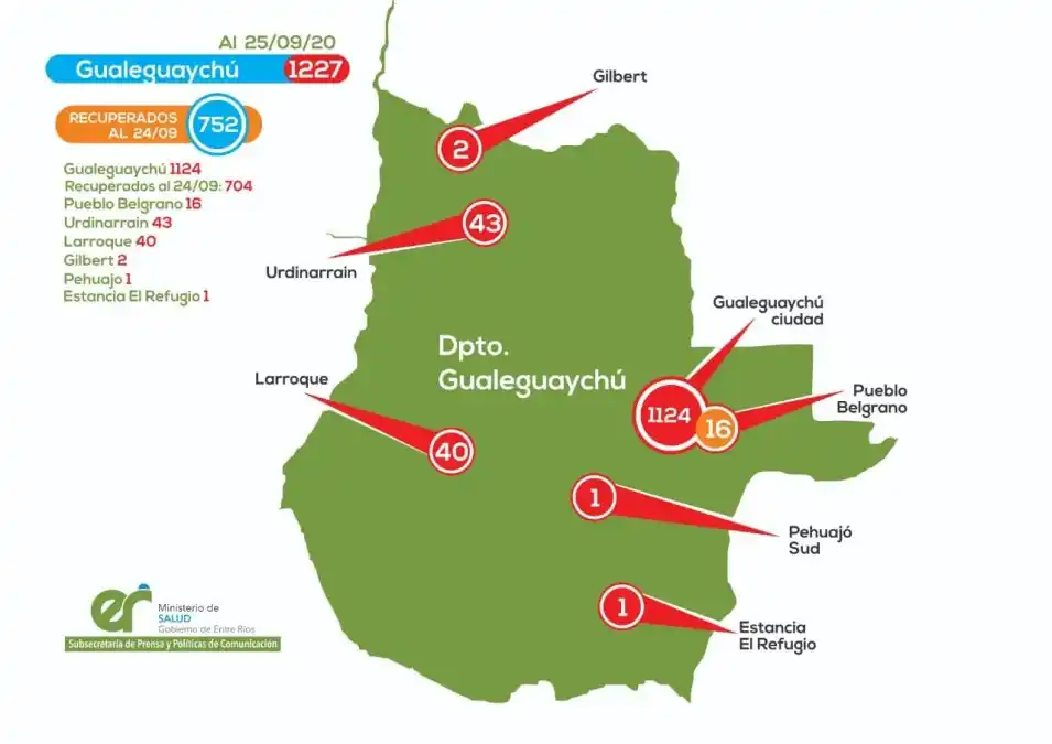 El área de Vigilancia Epidemiológica, confirmó que este viernes en Entre Ríos se registraron 186 nuevos casos de coronavirus, que se distribuyen departamentalmente de la siguiente manera: - Paraná: 126 - Gualeguaychú: 23 (21 en la ciudad y 2 en Urdinarrain) - Villaguay: 6 - La Paz: 5 - Nogoyá: 5 - Gualeguay: 4 - Victoria: 4 - Diamante: 3 - Tala: 3 - Concordia: 2 - Federación: 2 - Uruguay: 2 - Federal: 1 De ese modo, en la provincia son 6.944 los casos confirmados. LOS CASOS EN GUALEGUAYCHÚ