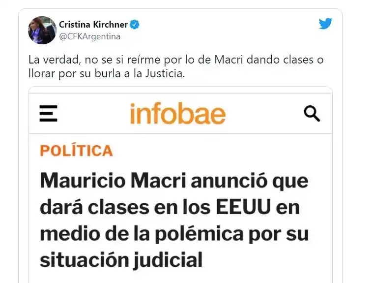 La vicepresidenta Cristina Kirchner reaccionó este miércoles a través de sus redes sociales, luego de conocerse que el ex presidente Mauricio Macri no cumplirá mañana la citación a indagatoria a la cual que fue convocado en la causa por supuesto espionaje ilegal a familiares de los tripulantes del submarino ARA San Juan. El ex jefe de Estado no se presentará a declarar en la ciudad de Dolores, ya que aceptó una invitación para participar en Estados Unidos de un programa de liderazgo académico en una cátedra de economía. Ante ese argumento, Cristina Kirchner escribió en su cuenta de Twitter: "La verdad, no sé si reírme por lo de Macri dando clases o llorar por su burla a la Justicia". Ese comentario tuvo lugar minutos antes de que la vicepresidenta ingresara al Senado para encabezar la primera sesión de presencialidad plena, desde el inicio de las restricciones en el país por la pandemia de coronavirus, en marzo de 2020. Por la mañana, había reproducido un tuit del presidente Alberto Fernández, que cuestionó la tapa de un medio tras la renuncia de Elena Highton de Nolasco a la Corte Suprema. Macri no irá a la indagatoria A través de una carta, la titular del PRO, Patricia Bullrich, le confirmó al juez Martín Bava que el ex presidente no se presentará mañana a la indagatoria en Dolores. "El Ing. Macri se encuentra fuera del país cumpliendo con sus compromisos internacionales, previendo su regreso para fines del corriente mes", explicó la ex ministra de Seguridad. En la misiva, Bullrich le pidió al magistrado evitar "cualquier decisión apresurada que sólo aumente el estrépito mediático que ya se ha generado con su intempestiva citación". Es decir, que no se lo declare "prófugo" o "en rebeldía", tal el caso del operador judicial Fabián 'Pepín' Rodríguez Simón que buscó refugio en Uruguay. Antes, el juez Bava dispuso que la Policía Federal intente notificar en diferentes domicilios al ex presidente Macri de su citación a declaración indagatoria por presunto espionaje ilegal a familiares de los fallecidos en el hundimiento del submarino ARA San Juan. Por último, Bava decidió este miércoles "no hacer lugar a la solicitud de autorización de salida del país" formulada por la defensa del procesado ex director de la Agencia Federal de Inteligencia (AFI), Gustavo Arribas, ya que con su pretendido viaje a Brasil y Uruguay podría acrecentar el riesgo de fuga. La resolución se produjo en el marco de la causa en la que Arribas está procesado por supuesto espionaje ilegal a familiares de los tripulantes del submarino San Juan y por abuso de autoridad y en la que Macri está llamado a indagatoria.