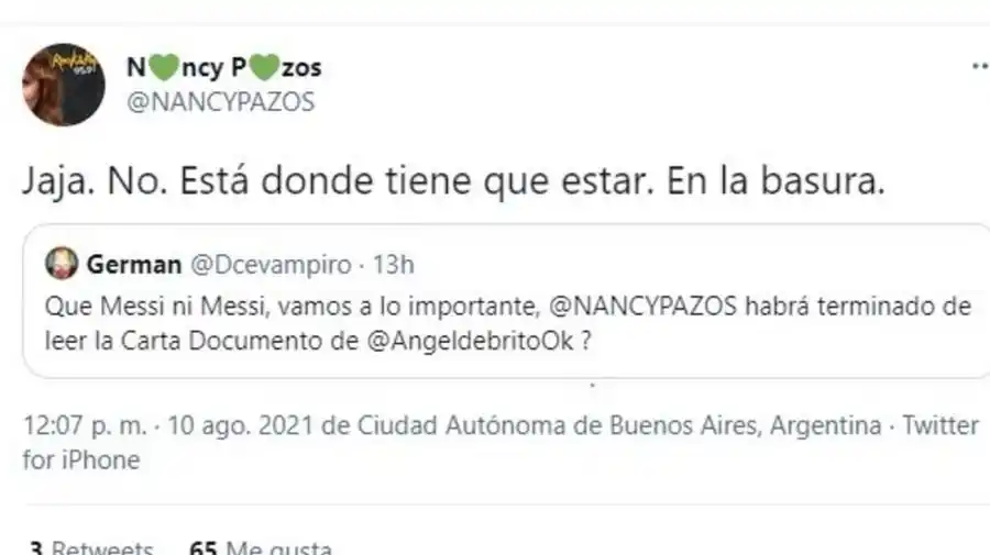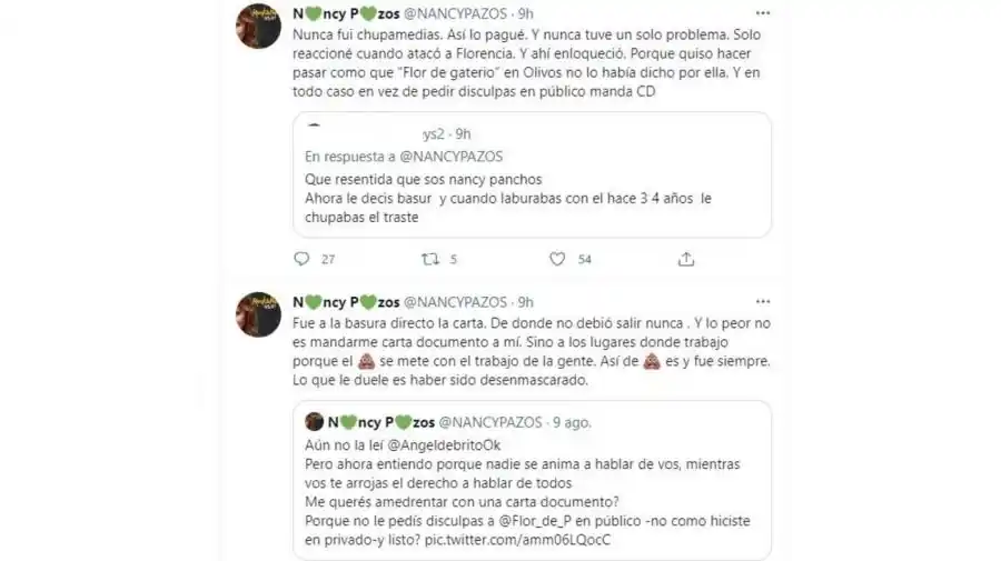 Ángel de Brito lleva a juicio a Nancy Pazos "por las mentiras que dijo" y porque se cumplió el plazo que tenía para retractarse. Sin embargo, la periodista ya había anunciado el destino de la carta documento que el conductor de LAM (El Trece) le envió el pasado 9 de agosto. El pasado lunes, apenas recibió la carta documento, Nancy Pazos publicó una captura del encabezado de la misma y escribió: "Aún no la leí @AngeldebritoOk", empezó. "Pero ahora entiendo por qué nadie se anima a hablar de vos, mientras vos te arrojás el derecho a hablar de todos", le lanzó mencionándolo en el tuit. "¿Me querés amedrentar con una carta documento?", agregó, para luego reclamarle: "¿Por qué no le pedís disculpas a @Flor_de_P en público -no como hiciste en privado-y listo?", cerró el posteo en su cuenta de Twitter. Luego, cuando el conocido usuario de Twitter @Dcevampiro le preguntó si había terminado de leer la carta documento de Ángel, ella respondió tajante: "Jaja, no. Está donde tiene que estar, en la basura". "Fue a la basura directo la carta, de donde no debió salir nunca. Y lo peor no es mandarme carta documento a mí, sino a los lugares donde trabajo porque el soret* se mete con el trabajo de la gente. Así de mierd* es y fue siempre. Lo que le duele es haber sido desenmascarado", sentenció la periodista, quien se desempeña actualmente como panelista en Flor de Equipo, el programa conducido por Florencia Peña en Telefe que compite directamente con LAM en El Trece. Al leerla, una seguidora le comento: "Que resentida que sos, Nancy Panchos. Ahora le decís basura y cuando laburabas con él hace tres o cuatro años le chupabas el traste". En respuesta, Nancy le dijo: "Nunca fui chupamedias. Así lo pagué. Y nunca tuve un solo problema. Solo reaccioné cuando atacó a Florencia. Y ahí enloqueció. Porque quiso hacer pasar como que 'Flor de gaterío' en Olivos no lo había dicho por ella. Y en todo casi en vez de pedir disculpas en publico manda carta documento".