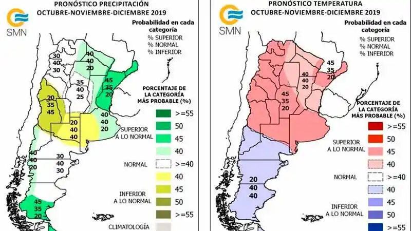 El Servicio Meteorológico Nacional estima que el Fenómeno "El Niño" se mantendrá neutral en lo que resta del año. En ese marco dio a conocer el pronóstico que abarca los meses de octubre, noviembre y diciembre, donde ratificó que tanto las lluvias como las temperaturas serían superiores a las normales en Entre Ríos y otras provincias del centro y Litoral argentino. En lo que respecta a precipitaciones, "se espera mayor chance de lluvias superiores a las normales sobre la región del Litoral y sur de Patagonia". Las lluvias serían normales o superiores a lo normal sobre el norte y centro-este del país, y oeste de Patagonia. Precipitaciones dentro del rango normal se prevén con mayor chance sobre el NOA, Córdoba y centro-noreste de Patagonia. Mayor probabilidad de precipitaciones normales o inferiores a las normales sobre La Pampa y oeste de Buenos Aires. Inferiores a las normales sobre Cuyo. Temperatura media Se espera mayor chance de ocurrencia de temperaturas superiores a las normales sobre el norte del Litoral, NOA y todo el centro del país. Normal o superior a la normal sobre las provincias del norte del país y sur del Litoral. Por otro lado se esperan temperaturas normales o inferiores a las normales sobre Patagonia.