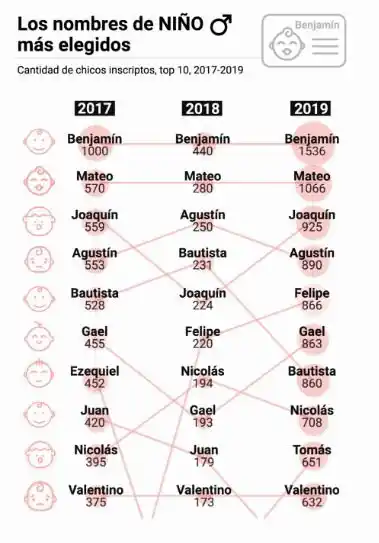 El nombre identifica, señala y también se lo relaciona con determinadas épocas o modas. Es una forma de individualizar a una persona dentro de una comunidad determinada y se convierte en un “sello personal” que no solo la acompaña durante su existencia sino también después de la muerte. Su elección no es tarea sencilla ya que muchas veces despierta debates, enojos y hasta burlas en el otro. Mientras algunos apelan a la creatividad, originalidad y transgresión, otros prefieren recurrir a las tradiciones familiares o fanatismos deportivos. Uno de los casos más emblemáticos fue el de Walter Rotundo, quien no dudó en ponerle a sus mellizas “Mara” y “Dona” en homenaje a Diego Maradona. El error cometido por una joven pareja santiagueña a la hora de nombrar a su hijo también cobró relevancia nacional por haberse equivocado en la utilización de una consonante. Jonatan Figueroa y Jazmín Pallares inscribieron a su bebé como “Juniors Xeneise”, en clara alusión a la entidad azul y oro, en lugar de hacerlo con “Z” (Xeneize). Azul Grana Álvarez (hija de un fanático de San Lorenzo), Diego Milito Nicolás Araya (de Racing), Newell’s Emiliano Chaperón (Newell’s), Lobo Octavio Olindi (Gimnasia de La Plata) y Benjamín Cai Vázquez (Independiente) son otros de los casos que reflejan la pasión por el fútbol de sus padres. Si bien en la antigüedad los nombres fueron regulados por el Estado por razones políticas, de orden público, de costumbres y para cortar la ola de extravagancias; el Registro Civil porteño empezó a eliminar las restricciones a partir de 1999 para que puedan utilizarse los nombres que deseen los padres y madres (incluso los extranjeros y los aborígenes). Pero hay excepciones: se prohíben aquellos nombres que resulten ofensivos o que "lesionen el honor" de la persona que lo va a llevar, no pueden ser más de tres nombres porque no hay espacio en el DNI, tampoco está permitido inscribir el mismo primer nombre a hermanos vivos, y no permiten usar un nombre de mujer para un varón o viceversa (salvo que sea José María, Andrea, Carmen, René, Tránsito, Rosario o Luján). Los nombres más elegidos de 2019 Más allá de la libertad que tienen las familias para nombrar a sus hijos, en la Ciudad de Buenos Aires hace tres años que se vienen imponiendo los mismos nombres de nena y de varón entre los más elegidos. El ranking de 2019 lo sigue encabezando Benjamín, que este año fue el favorito con 1.536 inscripciones; e Isabella, con 1.317. El top ten de varones se completa con: Mateo, Joaquín, Agustín, Felipe, Gael, Bautista, Nicolás, Tomás y Valentino. Mientras que el de las nenas con: Sofía, Valentina, Emma, Martina, Catalina, Jazmín, Victoria, María y Mía. Una de las particularidades de este año es que en el género femenino se produjo un empate con el nombre Sofía, que obtuvo el mismo número de preferencias que Isabella. Mientras que también se destaca la aparición de nombres poco comunes como Yhamil y Zenón (para ellos) y Yara (para ellas) en el listado completo. “Decir que son nombres raros es una apreciación subjetiva. Lo que sí llama atención es que son poco utilizados. Este año aparecieron nombres vinculados a series de TV de moda como Khaleesi de Game of Thrones, y Toki y Merlín de La Casa de Papel”, contó Mariano Cordeiro, director del Registro Civil y Capacidad de las Personas que depende del ministerio de Gobierno porteño. Otro dato llamativo fue la utilización de nombres neutros, tanto para nenes como para nenas. “En esa categoría Anderson fue de los más elegidos”, precisó Cordeiro. Los nombres prohibidos A lo largo de su gestión, el funcionario solo tuvo que prohibir dos nombres. Y uno de ellos ocurrió este año. “Vinieron unos padres que querían ponerle Satanás a su bebé. Si bien no fue una negación expresa de parte nuestro, mantuvimos una charla con ellos y le hicimos entender que no era razonable. Finalmente aceptaron nuestra sugerencia”, relató. El otro nombre prohibido fue Nada. Un matrimonio quiso inscribir de esa manera a su hija en 2018 pero tampoco fue aprobado por el Registro.