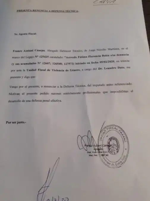 Franco Azziani presentó su renuncia para la defensa técnica de Jorge Nicolás Martínez y expresó los motivos en una carta al fiscal