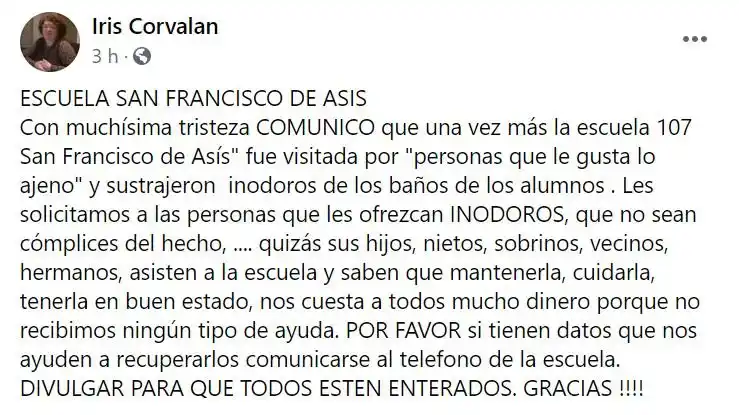 Según una publicación realizada en Facebook por Iris Corvalán, directiva de la Escuela Nº 107 San Francisco de Asís, durante el fin de semana se produjo un robo en las instalaciones escolares ubicadas en la zona norte de Gualeguaychú. “Con muchísima tristeza comunico que una vez más la Escuela Nº107 San Francisco de Asís fue visitada por ‘personas que le gusta lo ajeno’ y sustrajeron los inodoros de los baños de los alumnos”, denunció. “Les solicitamos a las personas a las cuales les ofrezcan inodoros, que no sean cómplices del hecho”, suplicó y agregó: “Quizás sus hijos, nietos, sobrinos, vecinos o hermanos asisten a la escuela y saben que mantenerla, cuidarla, tenerla en buen estado nos cuesta a todos mucho dinero porque no recibimos ningún tipo de ayuda”. “Por favor, si tienen datos que nos ayuden a recuperarlos, comunicarse al teléfono de la escuela. Divulgar para que todos estén enterados. Gracias”, concluyó.