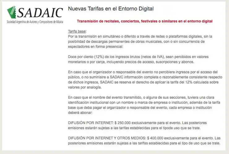 La Sociedad Argentina de Autores y Compositores (SADAIC) anunció que buscará empezar a cobrar el 12% de lo que se genere con las transmisiones de recitales y show vía streaming. A eso se le sumará una cuota fija de $250.000.